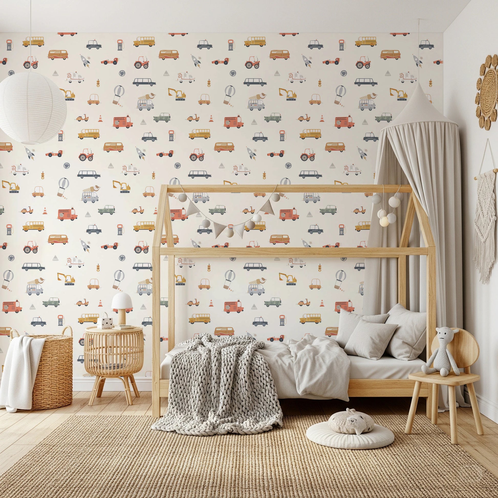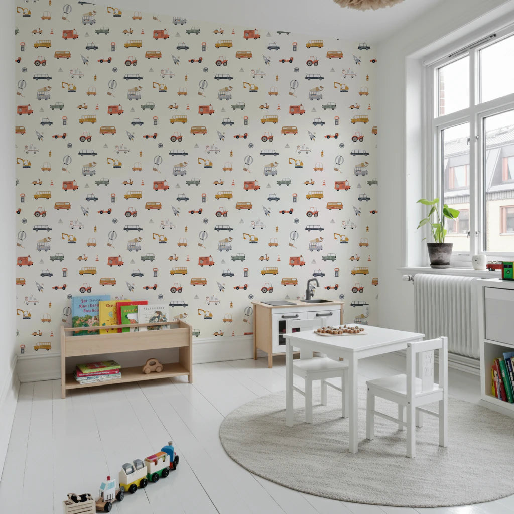 Hit the road with this whimsical and engaging wallpaper for walls. Boasting an array of illustrated cars, buses, and emergency vehicles, this playful pattern brings joy to any room. Warm, inviting colors create a lively ambiance that's perfect for kids' rooms, nurseries, and playrooms. Its delightful design fosters creativity and storytelling. The pattern blends seamlessly, adding a touch of adventure. Its versatility makes it a wonderful addition to any space, inspiring cheerful moods and adventures right at home.