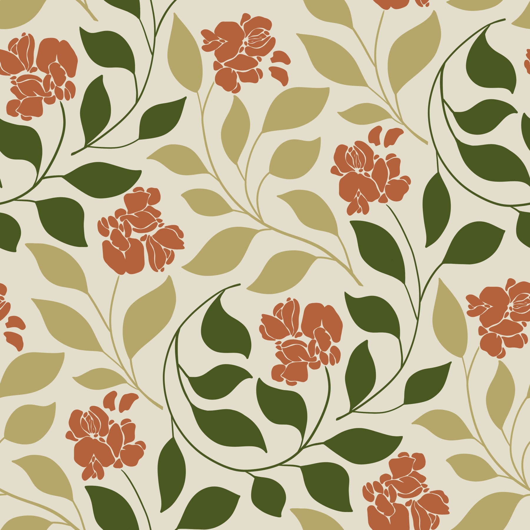 Bring a touch of nature indoors with this refined floral design. Deep olive leaves and copper flowers create a warm contrast against the light cream background. The simple, yet elegant pattern makes it a versatile choice for any room. This wallpaper for walls is an easy way to add visual texture and color to your space. Transform your dining room, bedroom or office. The understated colors complement any interior style while making a statement.