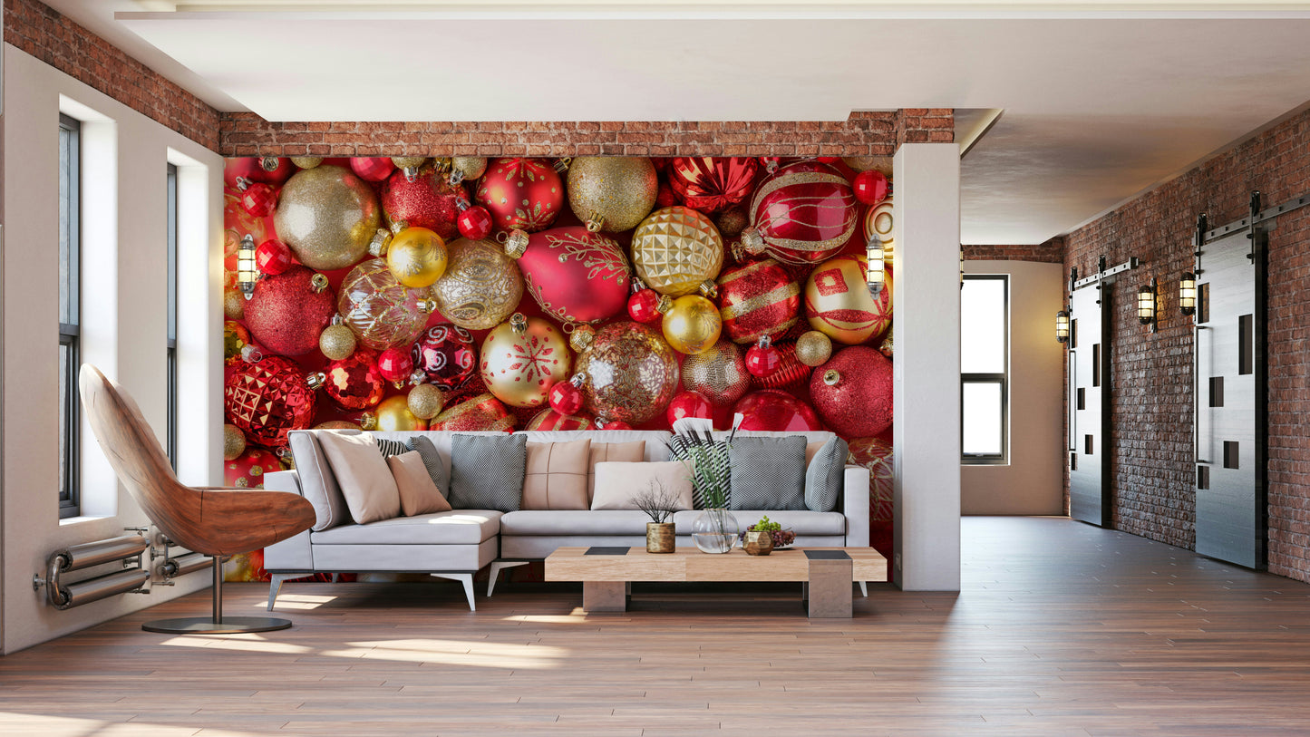 Infuse your space with radiant holiday splendor using this wallpaper for walls. This opulent pattern displays an array of gold and red Christmas ornaments. The combination of matte, shiny, and glittering finishes gives your wall a visual depth. Ideal for a dining room, it fosters an atmosphere of togetherness. The design complements a modern space or adds a bold twist to a classic design. This festive, shiny design is sure to create a memorable statement.