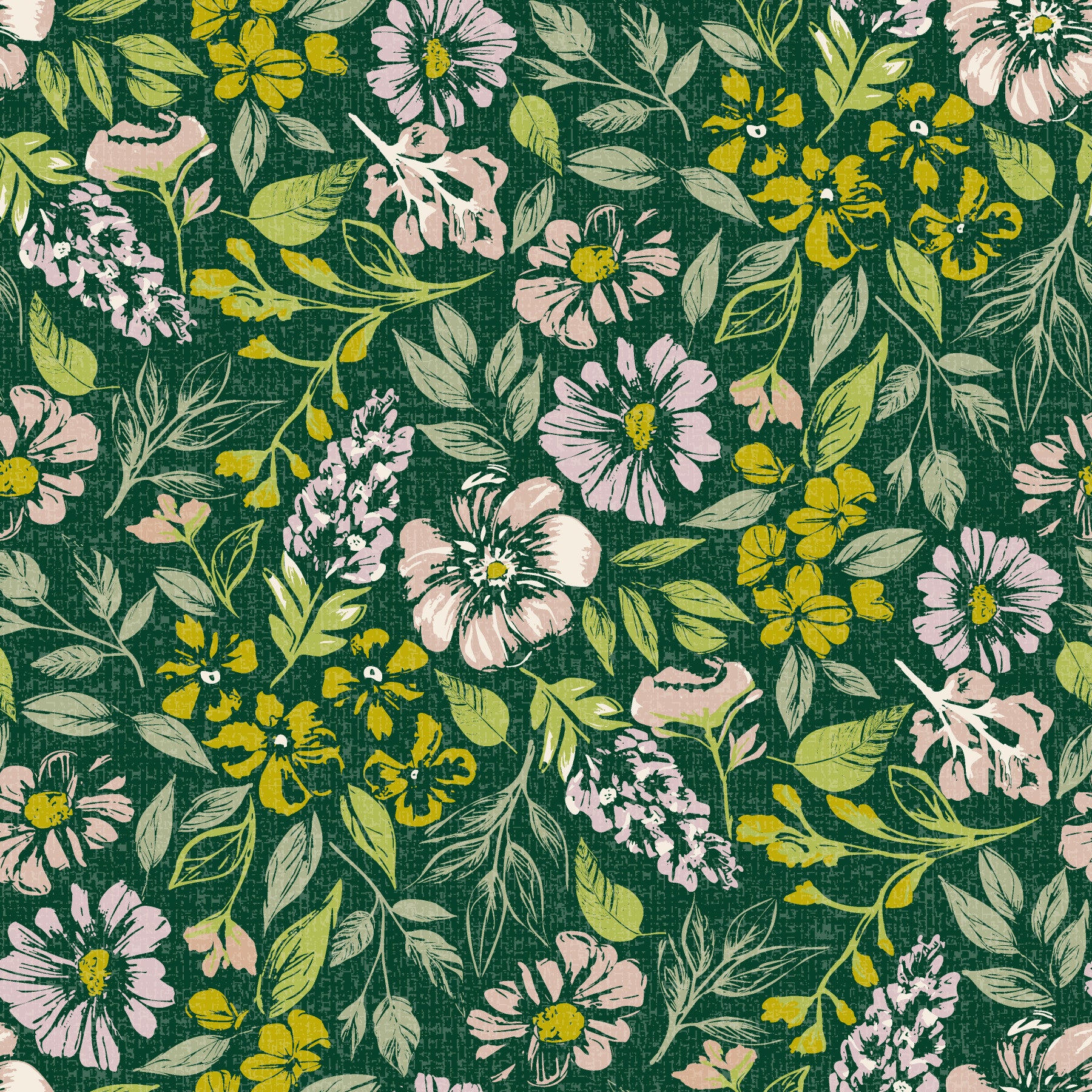 Experience the charm of a rustic countryside with this floral wallpaper. The design features a rich tapestry of hand-drawn flowers and leaves in soft pink, muted green, and golden yellow hues, all set against a textured dark green backdrop. The imperfect, slightly distressed feel of the artwork lends a vintage touch that evokes a feeling of cozy nostalgia. Ideal for creating a warm and inviting ambiance, this wallpaper effortlessly blends rustic and contemporary aesthetics.