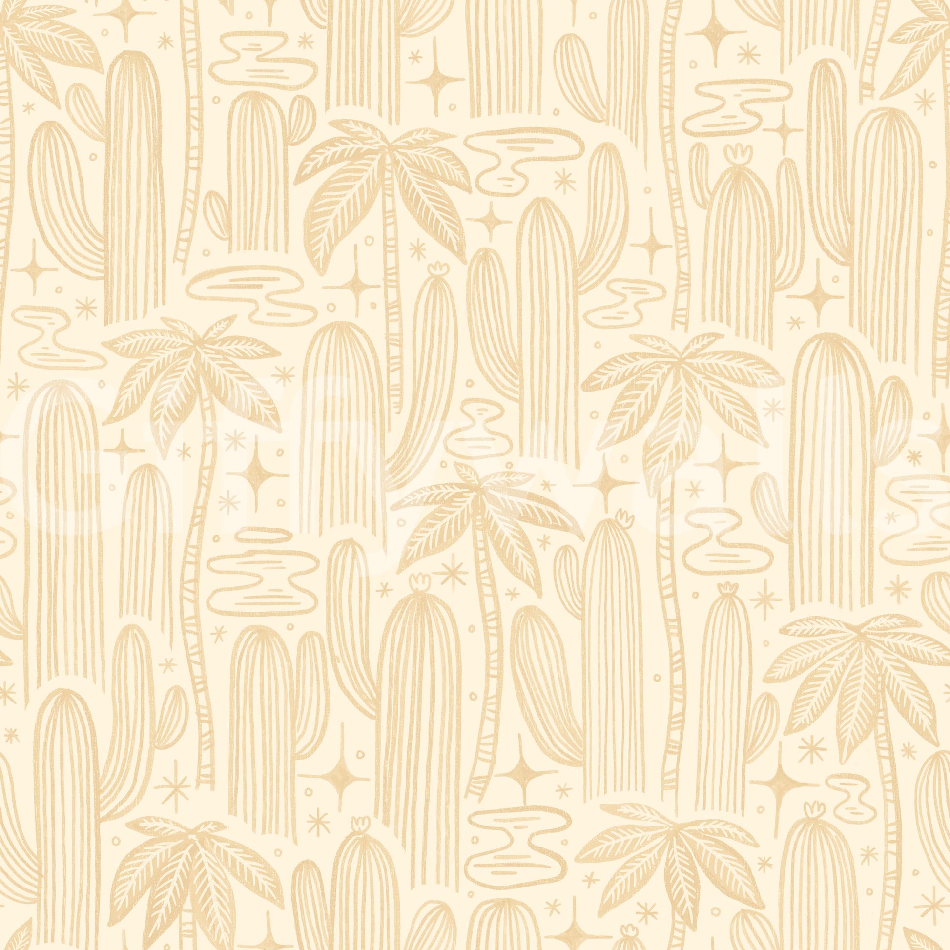 Bathed in an off-white glow, this wallpaper transports you to a serene desert landscape under a starlit sky. Elegant, hand-drawn saguaro cacti and palm trees stand tall, their delicate lines creating a sense of calm amidst the tranquil scene. Subtle pools of water and sparkling stars scattered across the off-white background complete the dreamy, minimalist aesthetic. The warm, sandy beige tones evoke a feeling of peaceful warmth, making this the perfect backdrop for relaxation and contemplation. This design is ideal for creating a soothing and stylish ambiance in any digital space.