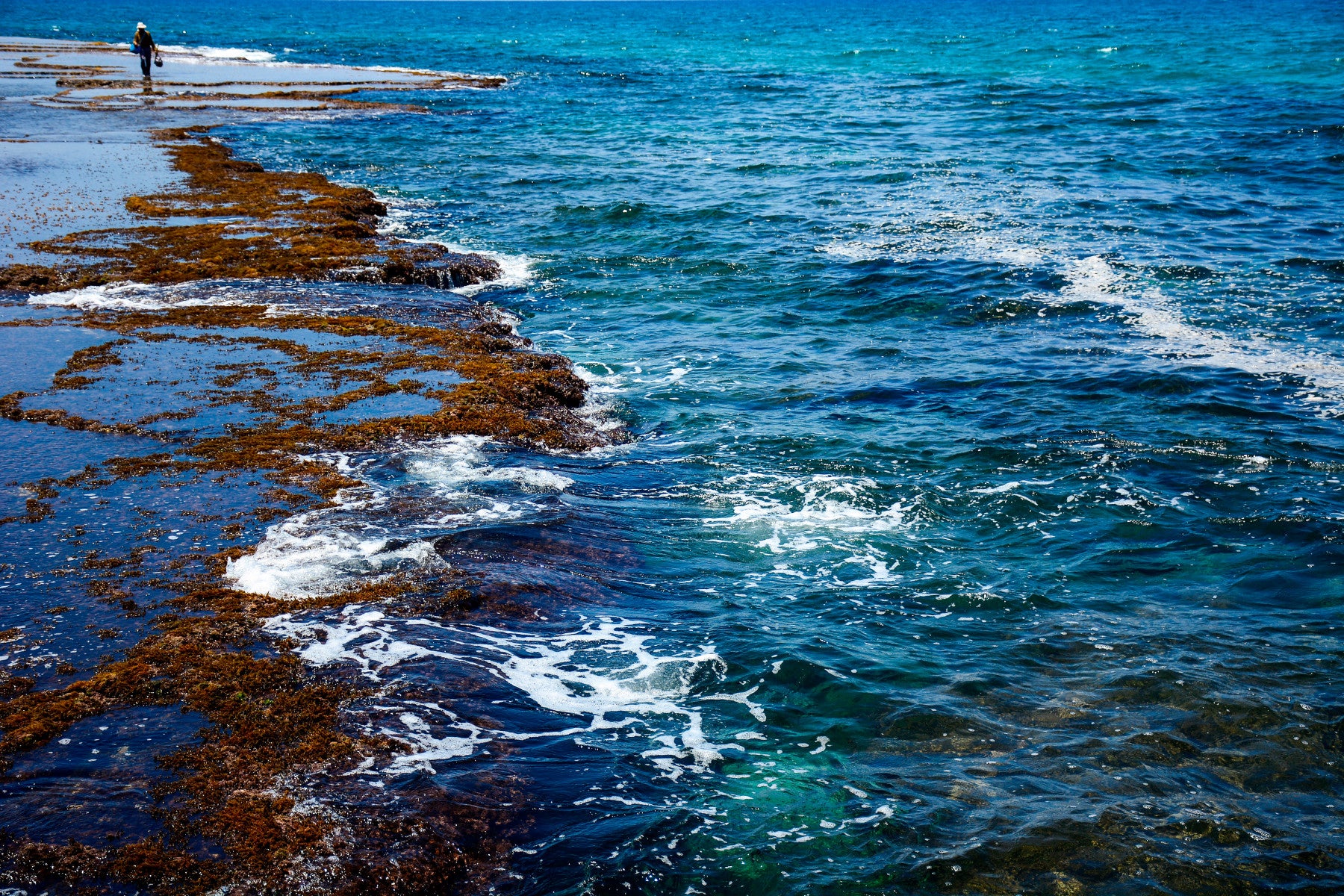Immerse yourself in the tranquil beauty of Sdot Yam with this captivating wallpaper, aptly titled Sdot Yam beach #5. This image showcases the raw, untamed coastline where turquoise waters meet the rugged shore. The clear, cerulean sea, laced with white foam crests, creates a mesmerizing contrast against the textured, seaweed-covered rocks. A lone figure, a silent observer or perhaps a local inhabitant, graces the horizon, adding a touch of human presence to the vast seascape. The rich blues of the water, combined with the earthy tones of the rocks and seaweed, create a visually soothing and grounding effect, transporting you to the serene shores of Sdot Yam with every glance. It is a vibrant snapshot of coastal beauty that invites relaxation and contemplation.