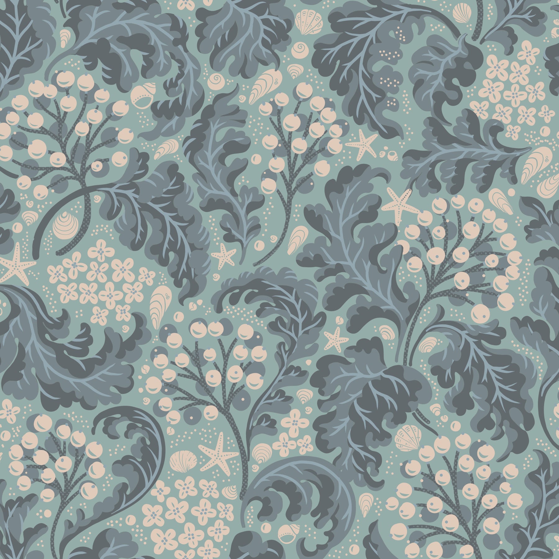 Dive into tranquility with 'Sea Kale - Aquatic Turquoise,' a captivating wallpaper design. Submerged in a serene aquatic turquoise backdrop, stylized sea kale leaves dance alongside delicate floral clusters and charming seashells. The muted, elegant color palette evokes a sense of calm and sophistication, while the whimsical illustrations bring a touch of playful fantasy. This wallpaper is perfect for creating a soothing and stylish atmosphere in any space, transporting you to a world of underwater serenity and botanical beauty. The intricate detailing and seamless pattern ensure a captivating visual experience, adding depth and interest to your walls.