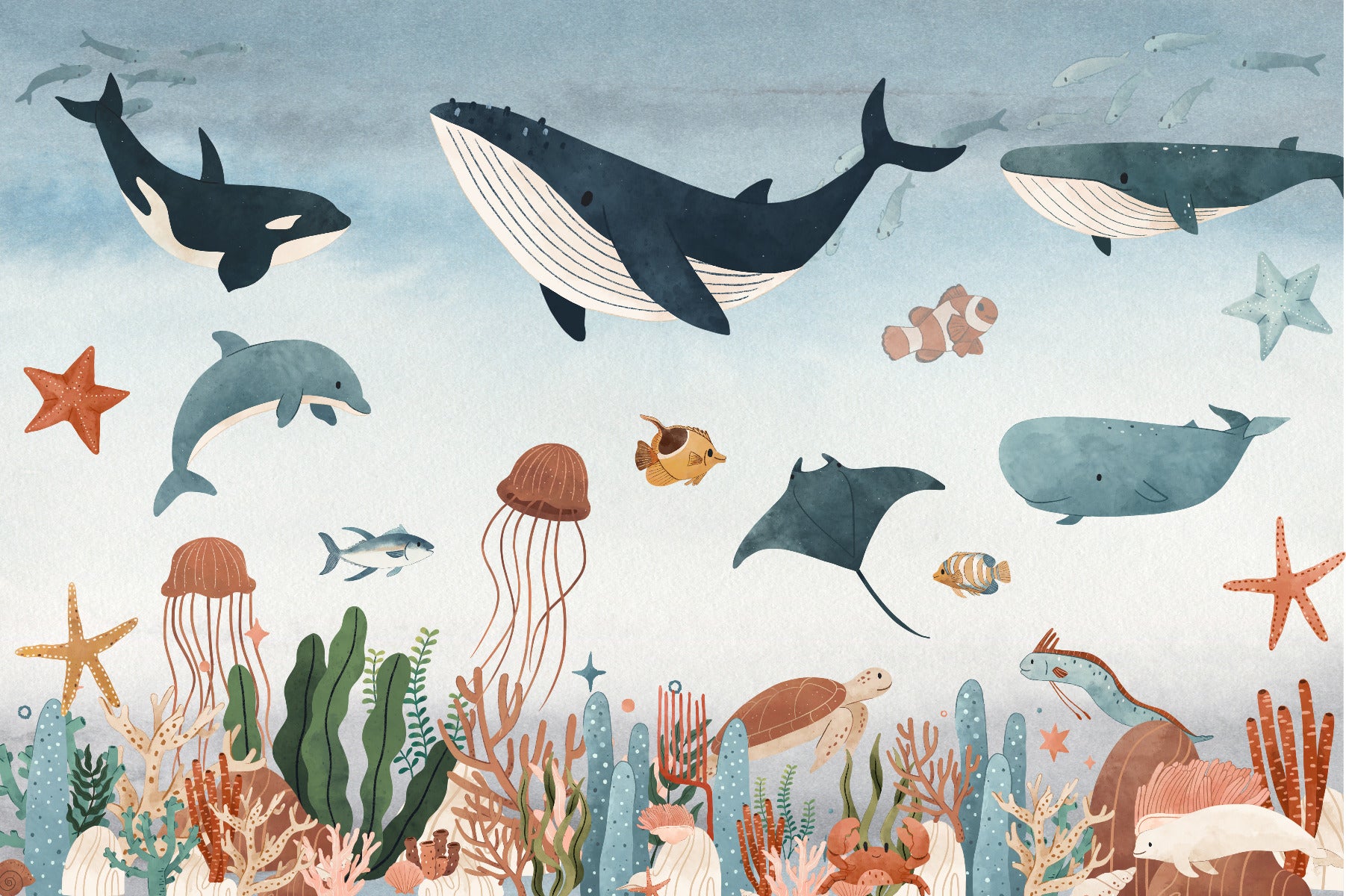 Embark on a melodious underwater journey with the sea symphony feature wall mural. Perfect for a nursery, this wallpaper wraps the room in a harmonious blend of marine life. Playful dolphins leap while majestic whales glide alongside schools of fish, all depicted in a serene, storybook style that sparks imagination and fosters learning. The rich tapestry of coral and starfish invites little ones to explore ocean depths from the cozy confines of their cradle. This nursery wallpaper is crafted for lasting wonder, making it an ideal backdrop for countless bedtime stories and dreams of aquatic adventures. It's a treasure trove of visual lullabies for your tiny tot's first foray into the vastness of the seas.