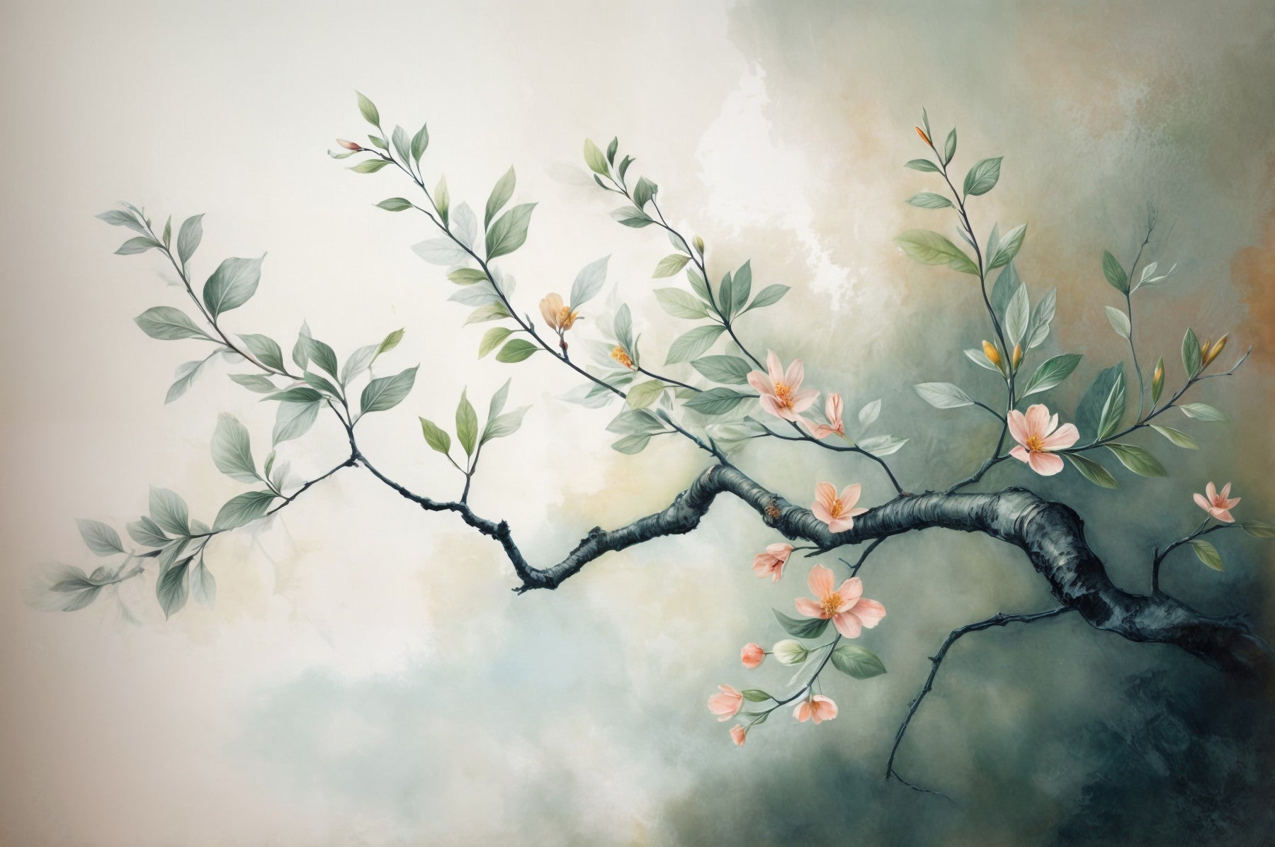 This wallpaper brings a touch of spring to your walls with its delicate branch and floral design. The subtle peach blossoms and soft green leaves create a soothing and elegant aesthetic. Ideal as wallpaper for walls in bedrooms or living areas. The calming color palette promotes relaxation. The design will complement interiors by bringing a natural, sophisticated element to any space. Infuse your home with the peace and understated style of nature.
