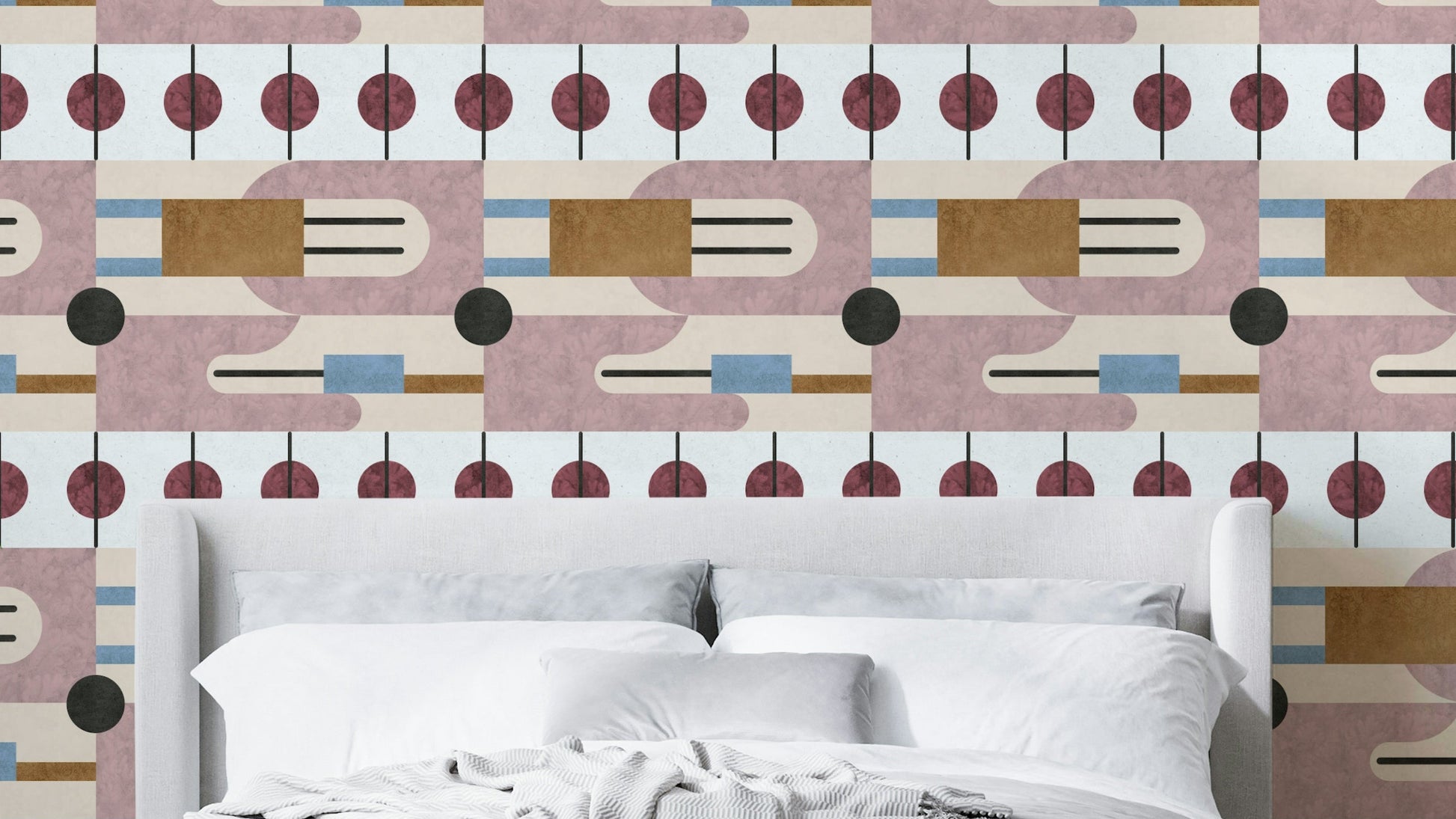 This wallpaper evokes a sense of calm and sophistication with its minimalist geometric design. Soft, muted tones of dusty rose, beige, and muted blue create a serene atmosphere. The interplay of organic shapes and crisp lines adds visual interest and a touch of modern elegance. Perfect for bedrooms, living rooms, or any space needing a touch of tranquility and understated style. The textured effect adds depth and visual richness, elevating this design beyond a simple pattern.
