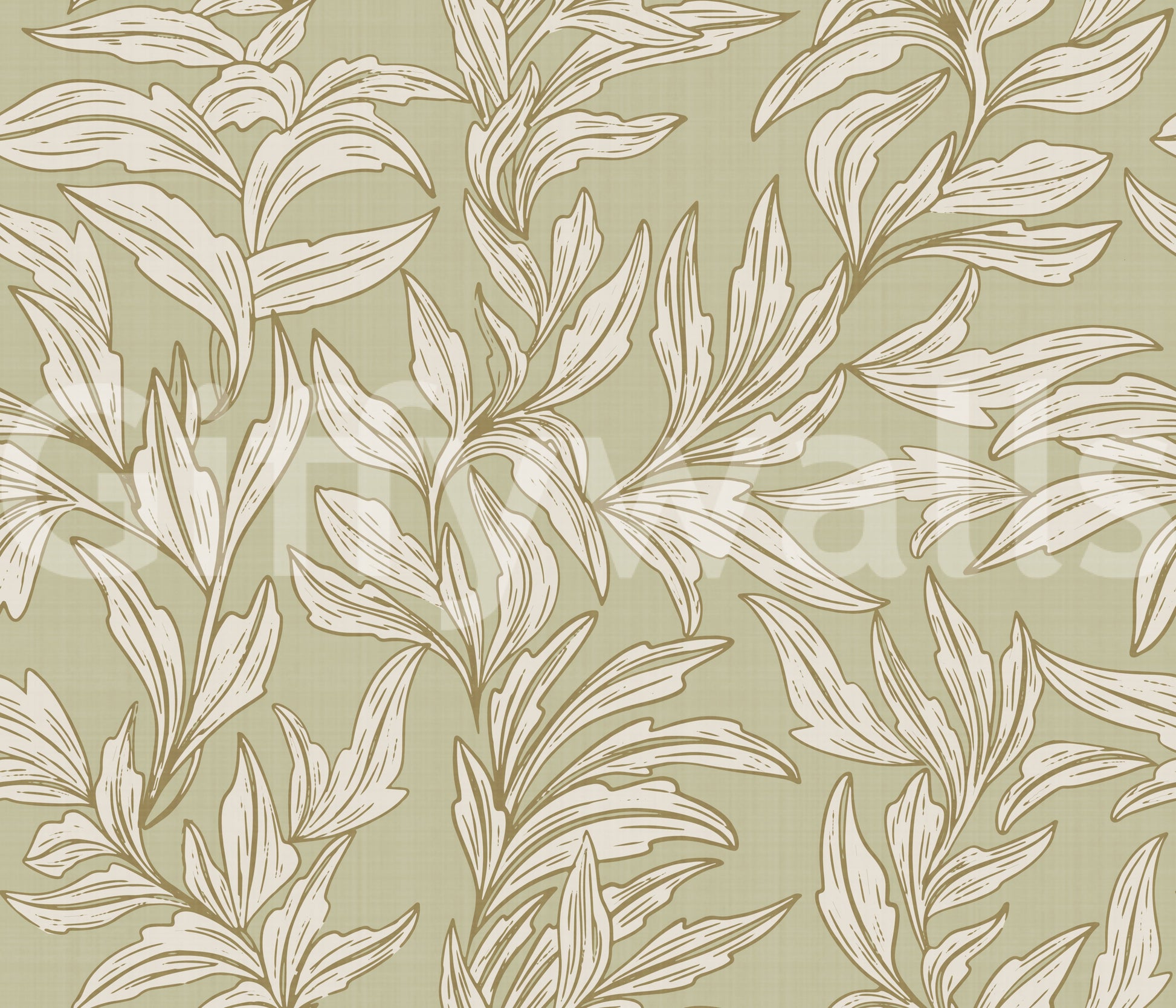 This wallpaper design evokes a sense of calm and tranquility with its intricate botanical pattern. The delicate, hand-drawn style of the off-white leaves against a muted sage green background creates a sophisticated and understated aesthetic. The seamless pattern is perfect for adding a touch of elegance to any room, from bedrooms to living rooms, bringing a peaceful and natural ambiance to your space. Its muted tones create a versatile backdrop that complements various interior styles, from modern minimalism to classic elegance. The detailed leaf illustrations offer a visual richness without being overpowering, making it an ideal choice for a serene and restful atmosphere.