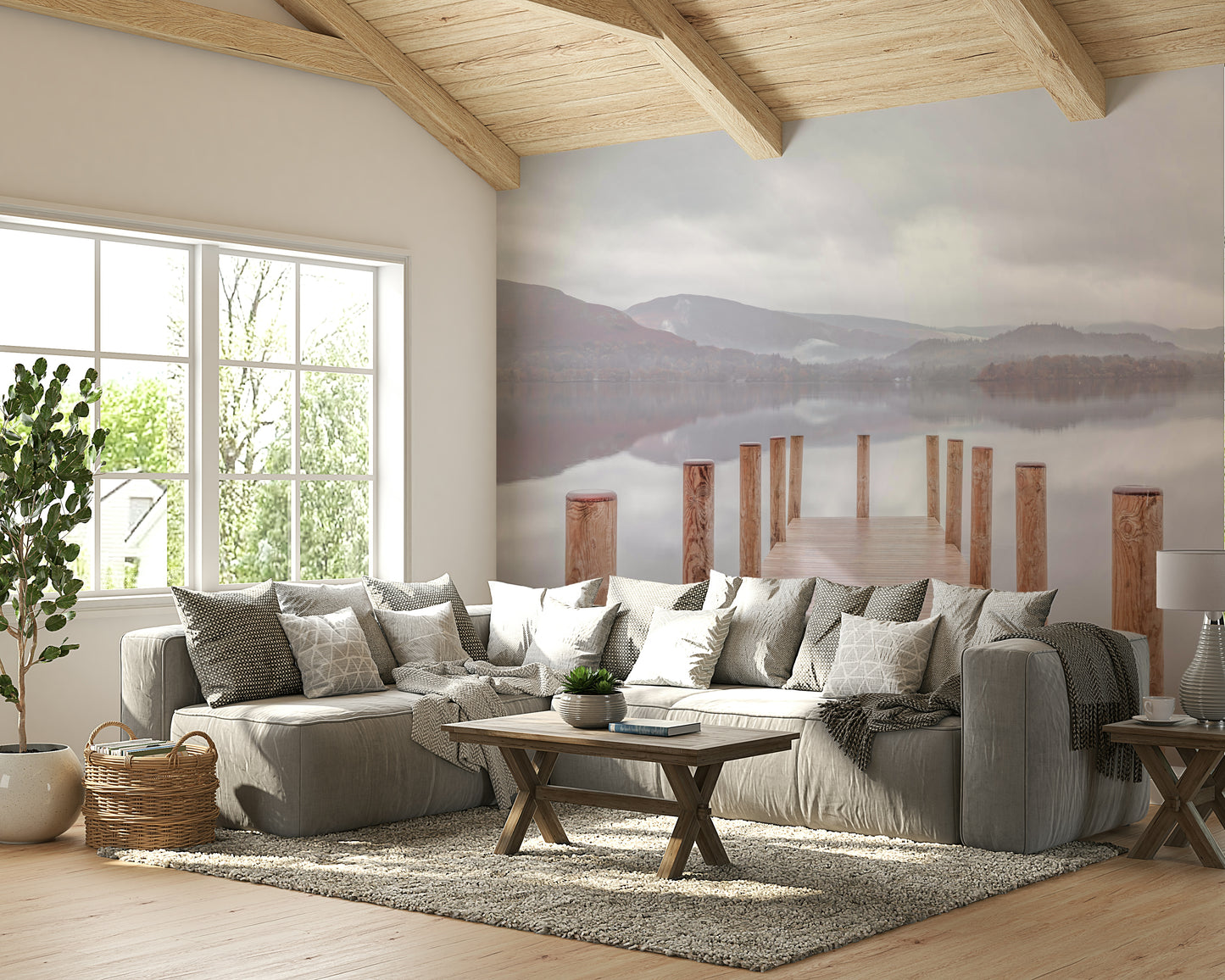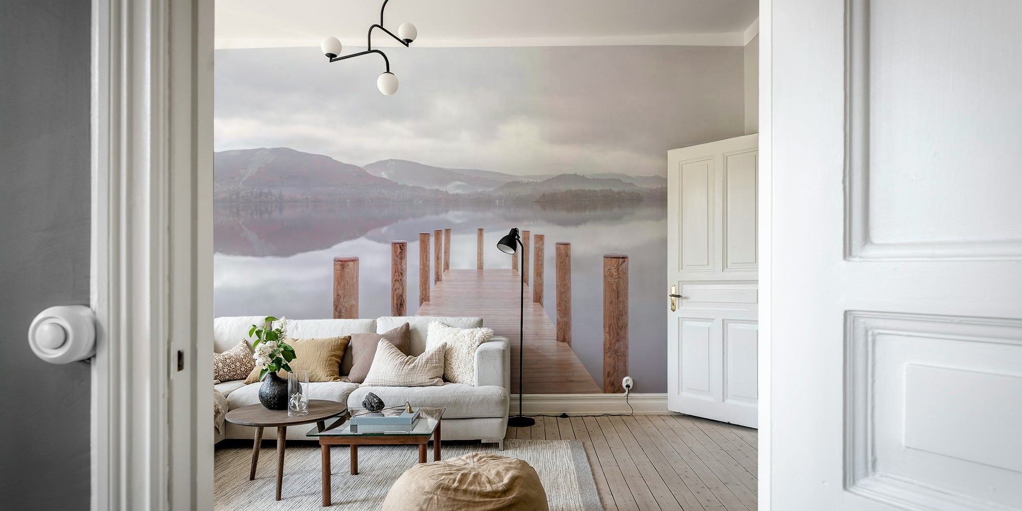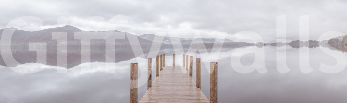 Wooden pier on the lake. Bring a peaceful touch to your home with this scenic landscape. Soft colors and a still lake create a calming mood. Wood posts lead the eye to distant hills, mirroring in the tranquil water. The muted palette makes this wallpaper for walls ideal for bedrooms, living rooms, or any space where relaxation is key. The subtle design of this wallpaper for walls complements minimalist interiors, adding depth without overwhelming the room.