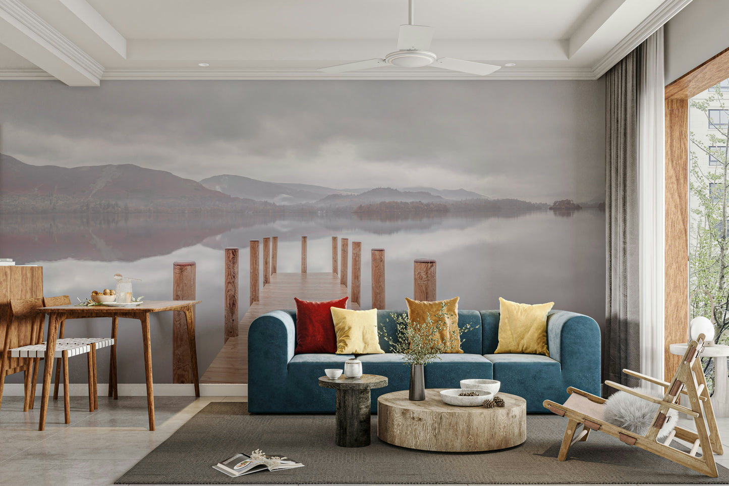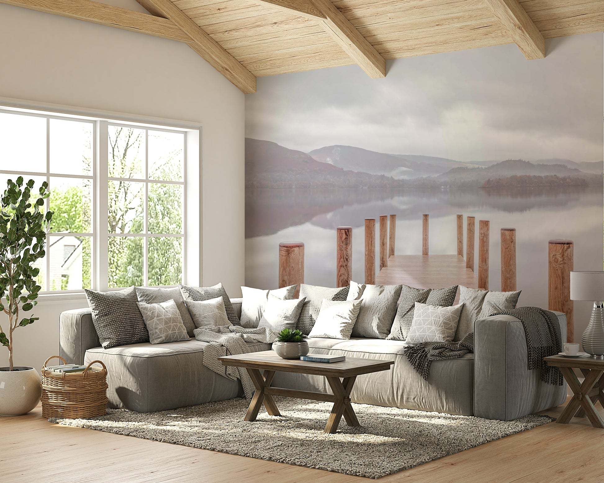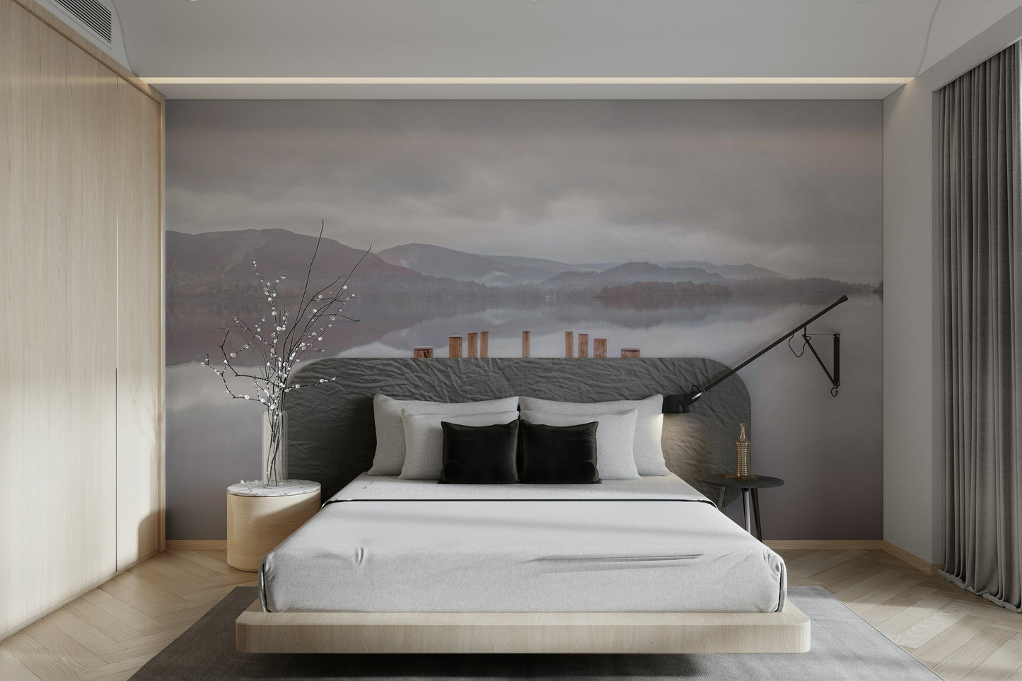 Wooden pier on the lake. Bring a peaceful touch to your home with this scenic landscape. Soft colors and a still lake create a calming mood. Wood posts lead the eye to distant hills, mirroring in the tranquil water. The muted palette makes this wallpaper for walls ideal for bedrooms, living rooms, or any space where relaxation is key. The subtle design of this wallpaper for walls complements minimalist interiors, adding depth without overwhelming the room.