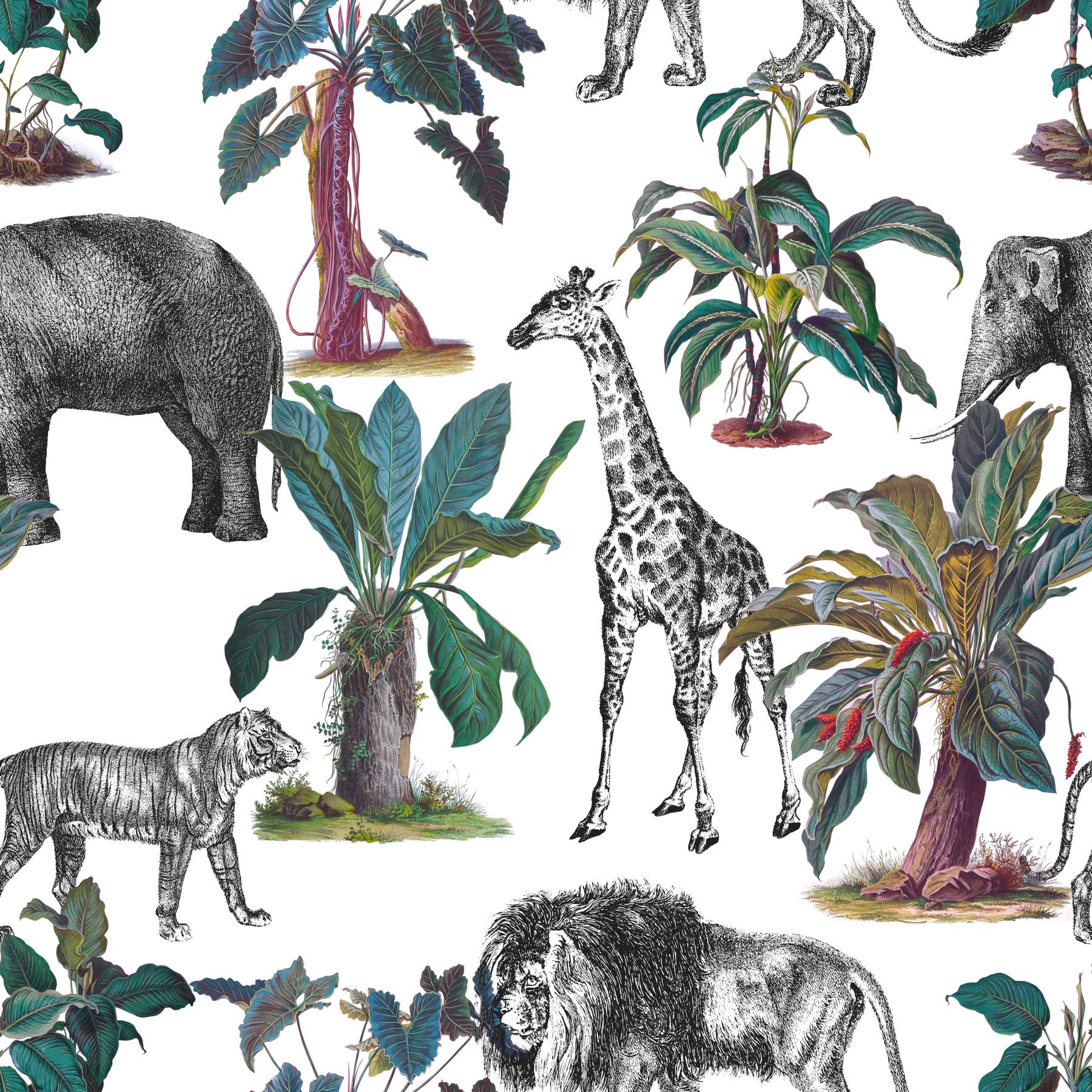 Step into the "Silva Original" wallpaper, a vintage-inspired exploration of the African savanna. This pattern interweaves detailed monochrome renderings of iconic wildlife - elephants, lions, tigers, and giraffes - with lush, vividly colored tropical flora. The stark contrast between the animals' intricate linework and the foliage's vibrant hues creates a striking visual tension, echoing the raw beauty and untamed spirit of the wild. This unique design brings an element of classic exploration and exotic natural history to any space, perfect for adding a touch of sophistication and adventure.