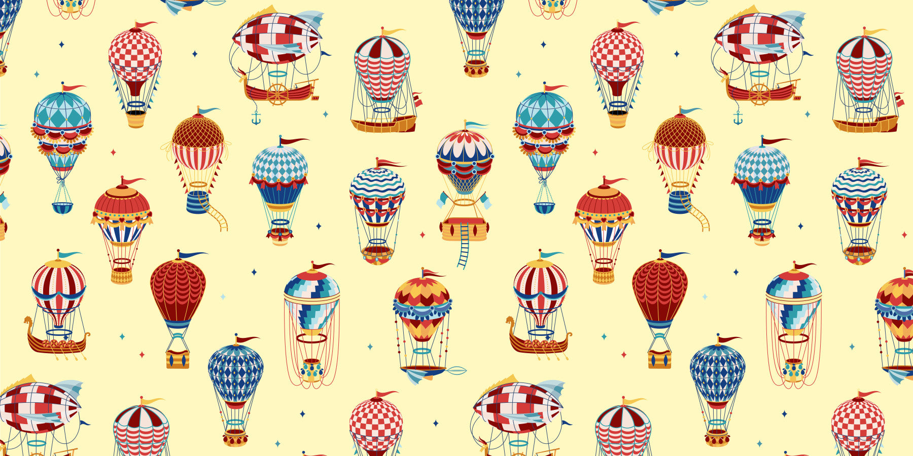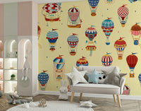 Take your decor to new heights with this whimsical wallpaper for walls. A joyful array of colorful hot air balloons float against a soft yellow backdrop. Each balloon is intricately designed with various patterns and styles. The lively design brings a sense of adventure and playful wonder to any room. Its bright colors make it excellent for a nursery, playroom, or kids room. This wallpaper energizes and complements interiors with its joyful charm.
