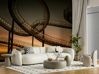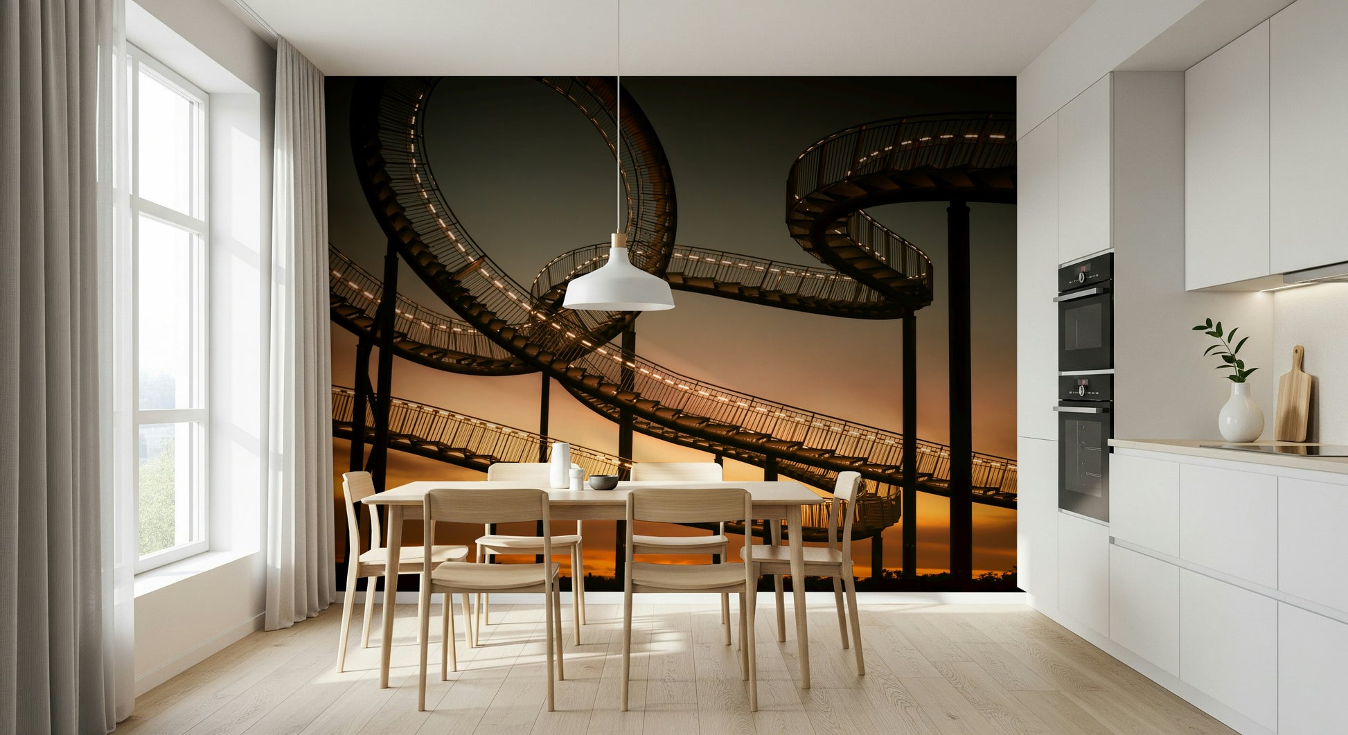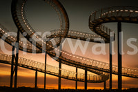 Ascend into a dreamlike vista with "Sky Steps", a wallpaper that transforms your screen into a gateway to the heavens. This mesmerizing image captures a fantastical stairway stretching towards a fiery sunset. Illuminated by rows of warm, inviting lights, the metallic structure weaves and loops, creating an illusion of infinite ascent. The evocative blend of industrial design and natural beauty evokes a sense of wonder and limitless possibility. Let your imagination soar as you contemplate the journey ahead, with each step a path to new heights. Ideal for those who seek inspiration and a touch of surreal artistry in their digital space, "Sky Steps" offers a calming yet captivating backdrop. Add a layer of depth and intrigue to your device with this stunning fusion of architecture and twilight's embrace.