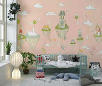 Enliven your space with this playful wallpaper for walls. This features quaint cottages perched on floating islands, complete with whimsical details like teddy bears, bunny rabbits, and clouds with dangling stars. The delicate lines and soft hues evoke a sense of calm and wonder. The design creates inviting spaces. It is perfect for a child's bedroom, playroom, or any area desiring a touch of storybook charm.