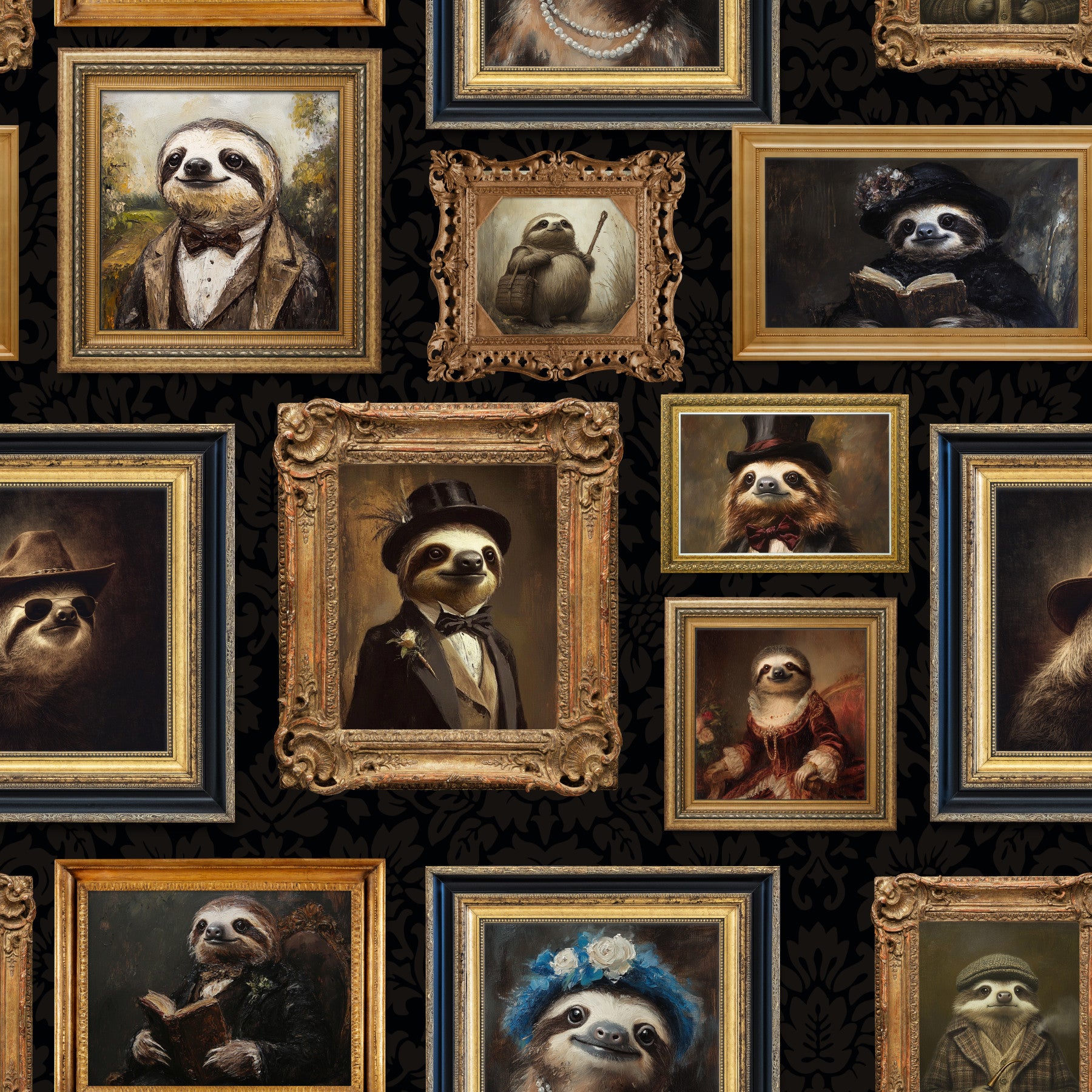Transform your home with this whimsical wallpaper by Uta Naumann for walls that presents a collection of sloth portraits in ornate frames. Each sloth is dressed in period attire, creating a charming and humorous gallery wall effect. The black damask backdrop adds depth and sophistication, perfect for adding a touch of playful elegance to living rooms, studies, or hallways. The refined palette ensures this unique design complements a variety of interior styles, adding character and conversation to your space.