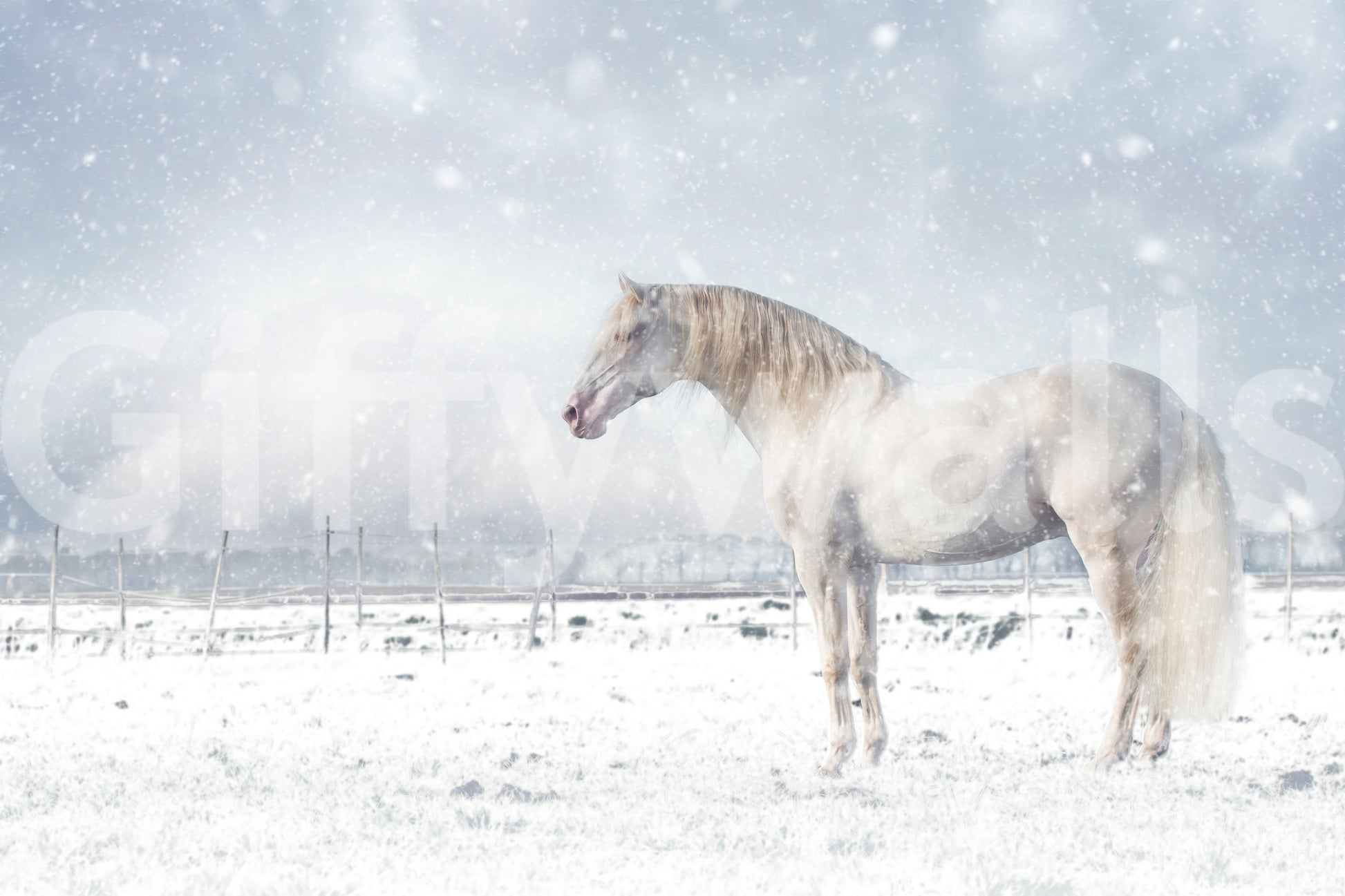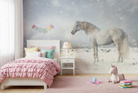 A graceful white horse stands in a snow-covered field, beautifully captured in this wallpaper. The delicate snowfall adds a touch of magic, while the neutral color palette brings a sense of tranquility to any room. Ideal for creating a calming atmosphere in your living room or bedroom. Consider this wallpaper for walls if you want to blend nature and elegance into your interior design. It perfectly suits both modern and traditional decor.