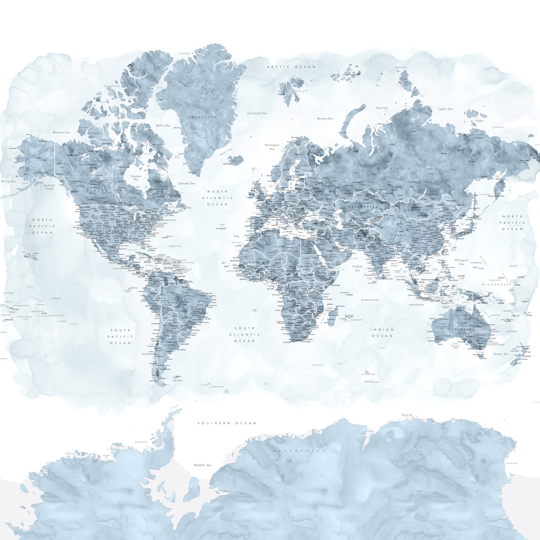 Bring timeless elegance and modern calm to your walls with the Steel Blue Watercolor World Map Wallpaper. Featuring soft shades of blue-gray in a delicate watercolor texture, this mural offers a refined and sophisticated take on world map decor. Each country and city is clearly labeled, blending functionality with artistic beauty. Perfect for offices, living rooms, bedrooms, or study areas, its cool tones pair effortlessly with minimalist, industrial, or Scandinavian interiors. Available in both peel-and-stick and traditional wallpaper options, it’s easy to install and made with eco-friendly materials. Discover the world in a tranquil and stylish palette of steel blue.