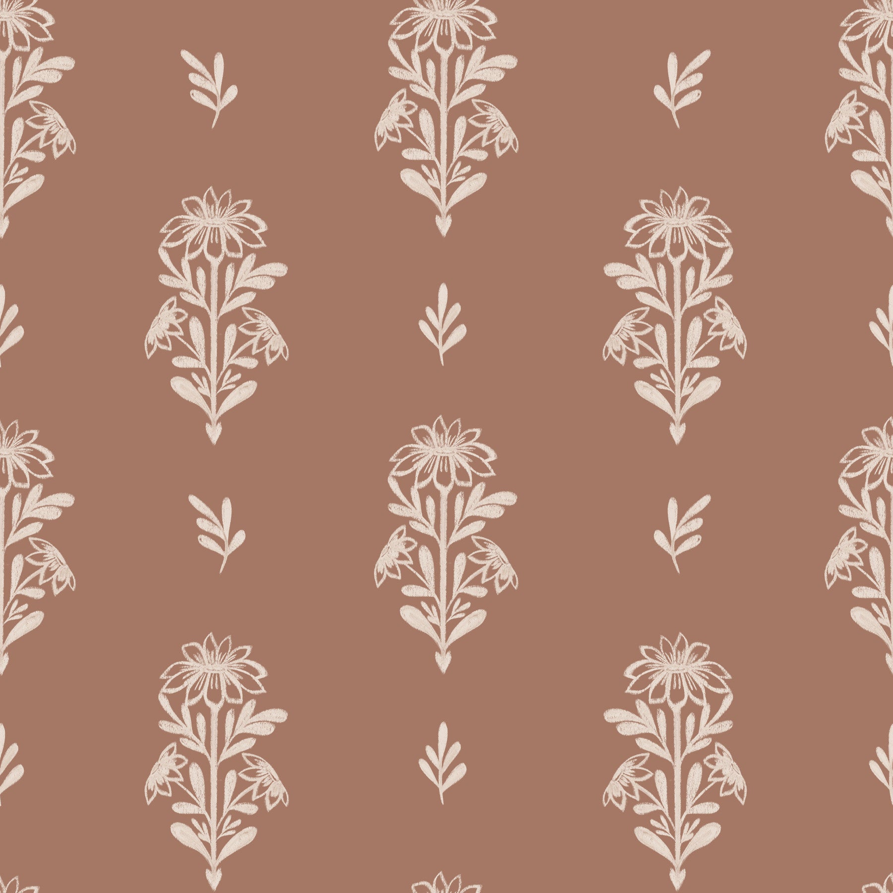 Embrace understated elegance with this terracotta floral wallpaper. Featuring a delicate, repeating pattern of off-white flowers and leaves rendered in a hand-drawn style, it evokes a sense of calm and tranquility. The subtle color palette and textured design lend a rustic charm, perfect for adding a touch of warmth to your space. This versatile wallpaper complements both modern and traditional interiors, creating a sophisticated yet cozy atmosphere. The seamless pattern allows for easy application and a visually pleasing result across your walls.
