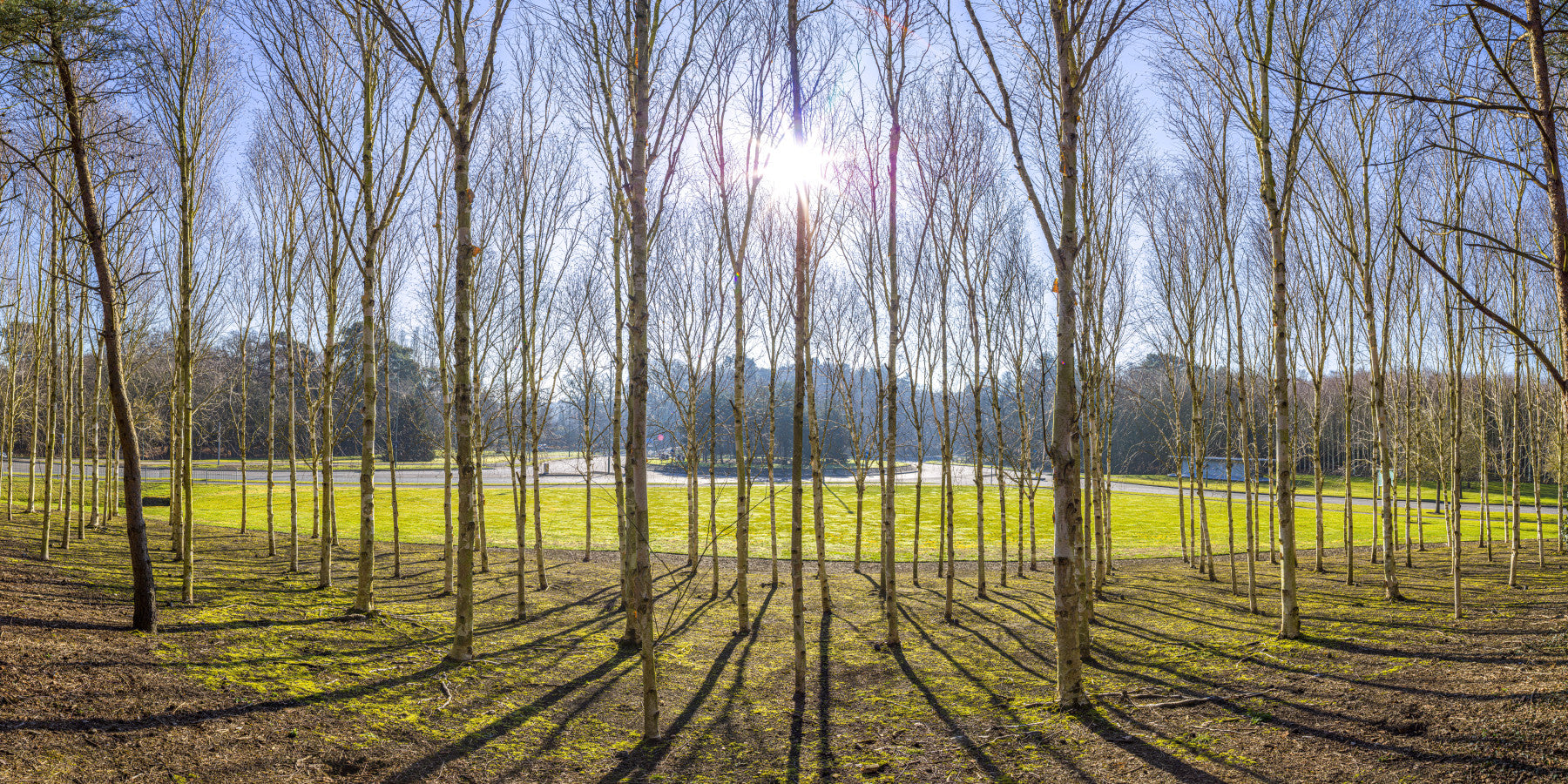 Autumn forest. Bring a touch of natural serenity inside with this detailed woodland scene. Tall, slender trees stand in neat rows, casting long shadows across a bright green meadow. The sunlight filtering through creates a calming, open ambiance. This wallpaper for walls transforms your space with a refreshing outdoor feel. It is perfectly suited for living rooms, bedrooms, or home offices, where the clean lines and natural tones will complement both modern and rustic interiors, bringing harmony and light to any room.