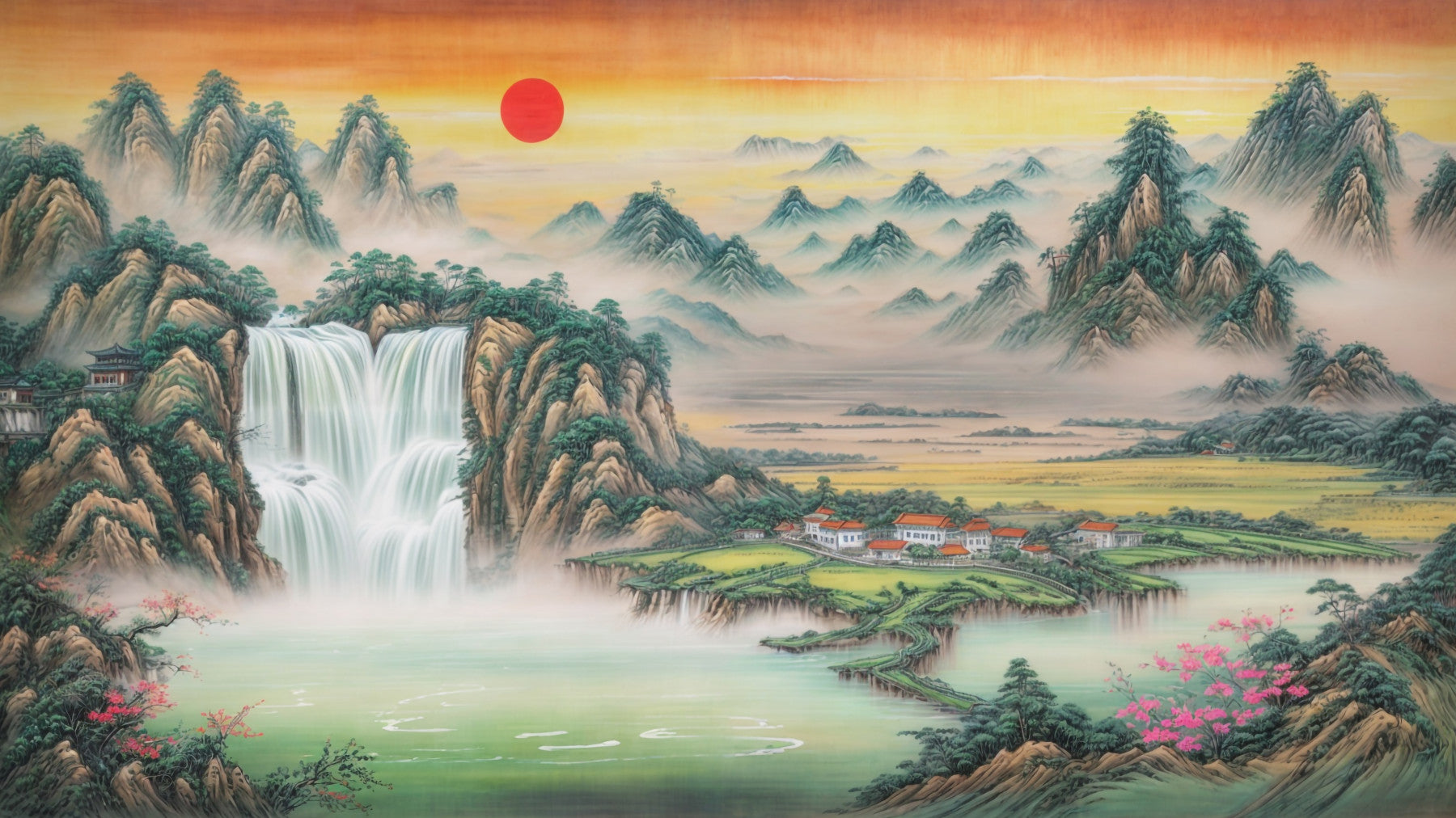 Bring an evocative scene into your home with this landscape creation. This unique wallpaper for walls features majestic mountains and flowing waterfalls under a vibrant sunrise. Warm orange and yellow blend with calming greens and beige to create a picturesque backdrop. Its soothing visual makes it perfect for a bedroom, living room, or home office. The detailed illustration complements interiors with a tranquil atmosphere, adding depth and a touch of nature-inspired elegance.