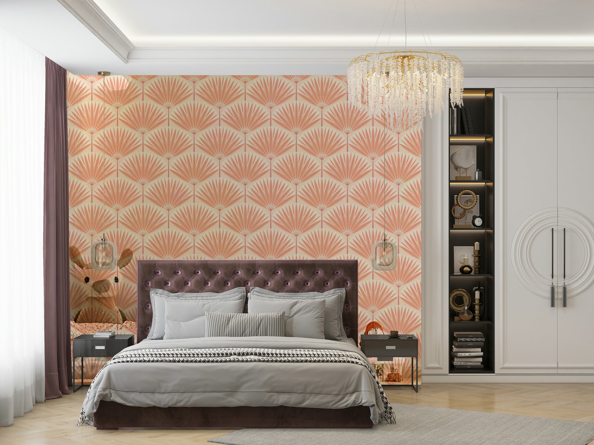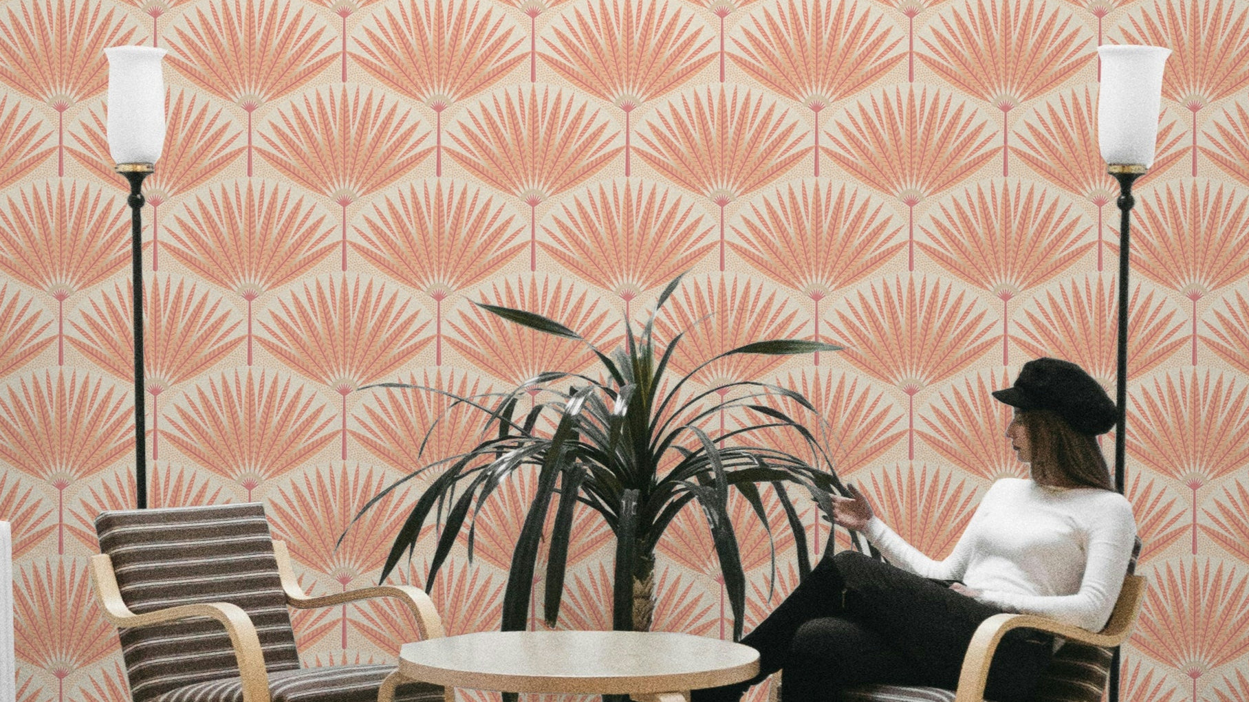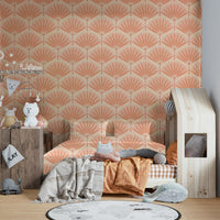 Bathe your walls in the warm glow of 'Sunset Palm Paradise'. This wallpaper features a stylized depiction of palm leaves in sunset hues of peach, coral, and cream. The design is a seamless pattern, perfect for creating a tranquil and calming atmosphere in any room. The subtle texture and soft color palette create a sense of serene sophistication. Whether in a bedroom, living room, or even a hallway, this wallpaper will transform your space into a peaceful oasis. The artistic, hand-drawn quality adds a touch of unique charm, making it a stunning focal point for your home decor.