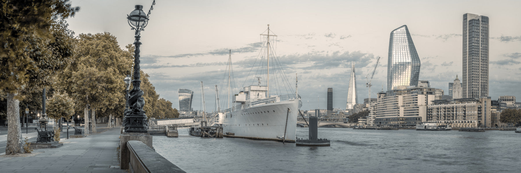 This mural wallpaper is a Thames Panorama design, a sweeping wall mural with a view of London's famous river and skyline. It's an excellent wallpaper for walls for a living room, office, or any space that needs a classic, city feel. The detailed print features an historic ship on the water and a mix of modern and classic architecture. Made from high-quality, durable material, this mural is a simple and quick way to refresh your home decor.