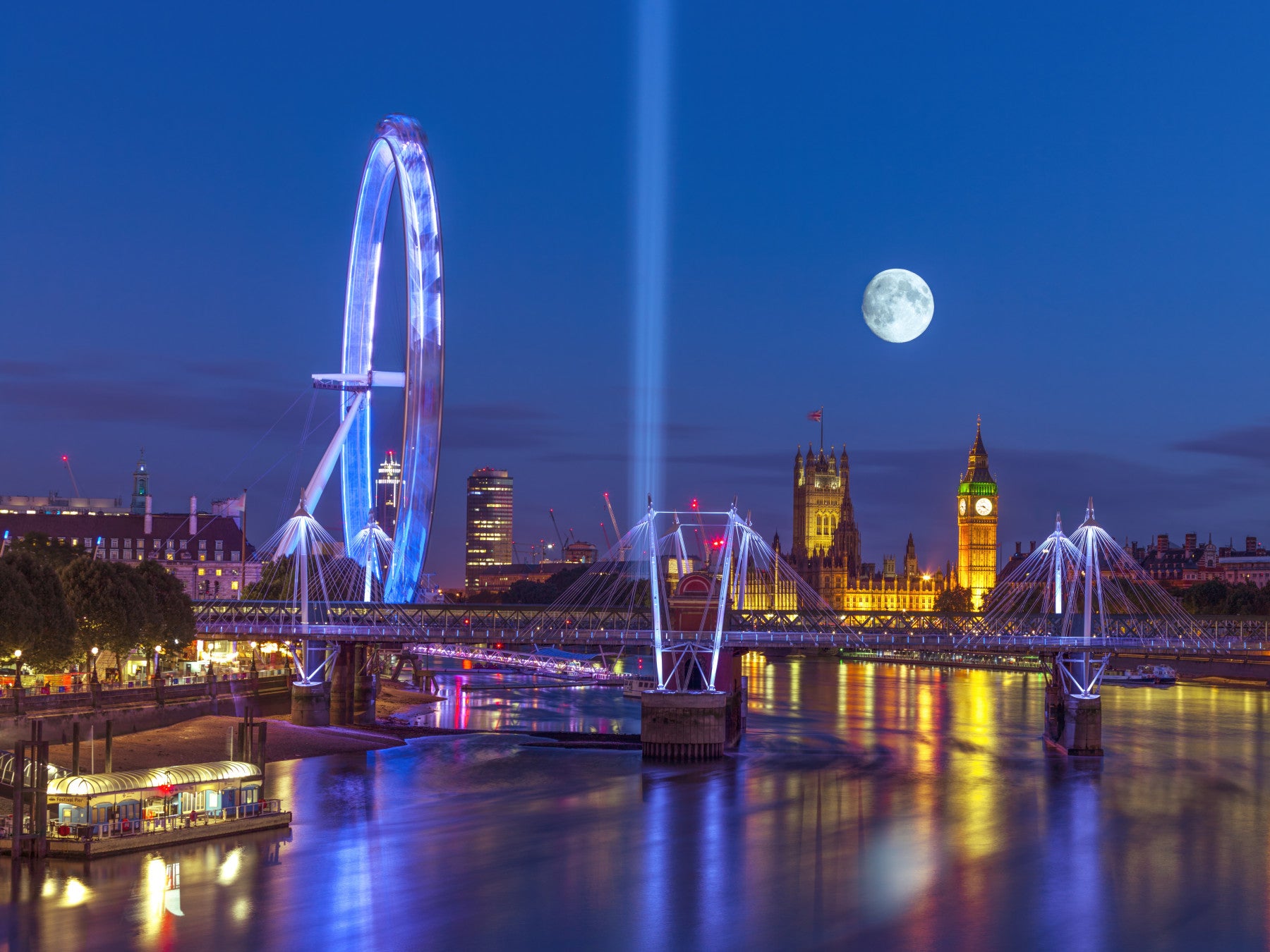 Night view of the London Eye, Golden Jubilee bridge and Westminster, London, UK. Experience the magic of London's skyline at twilight with this captivating wallpaper. It captures the beauty of the city's iconic landmarks, including the London Eye and the Houses of Parliament, illuminated against a dark blue sky. Gold reflects on the River Thames, adding depth. This wallpaper for walls gives any room a refined touch. Place it in a bedroom or dining room to make a captivating interior.