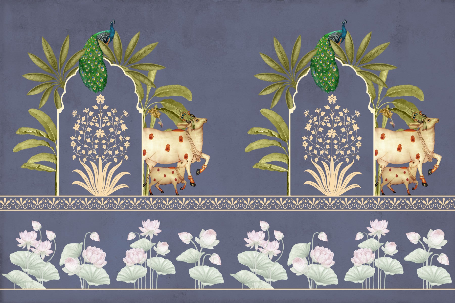 Step into a serene sanctuary with "The Neelambar Arch," a wall covering imbued with the tranquil essence of Indian artistry. The design features an archway framing a scene of stylized flora and fauna. Majestic peacocks perch gracefully atop verdant palm fronds, their jewel-toned plumage a striking contrast against the rich, deep blue (Neelambar) backdrop. Sacred cows, adorned with symbolic markings and traditional jewelry, evoke a sense of reverence and prosperity. The lower section showcases a delicate array of blossoming lotuses, their soft pink hues adding a touch of gentle femininity. This piece draws inspiration from traditional Indian miniature paintings, re-imagined for the modern home. Invite a sense of heritage and peaceful grandeur to your living space with this wallcovering that speaks of ancient wisdom and timeless beauty, creating a focal point that is both captivating and calming.