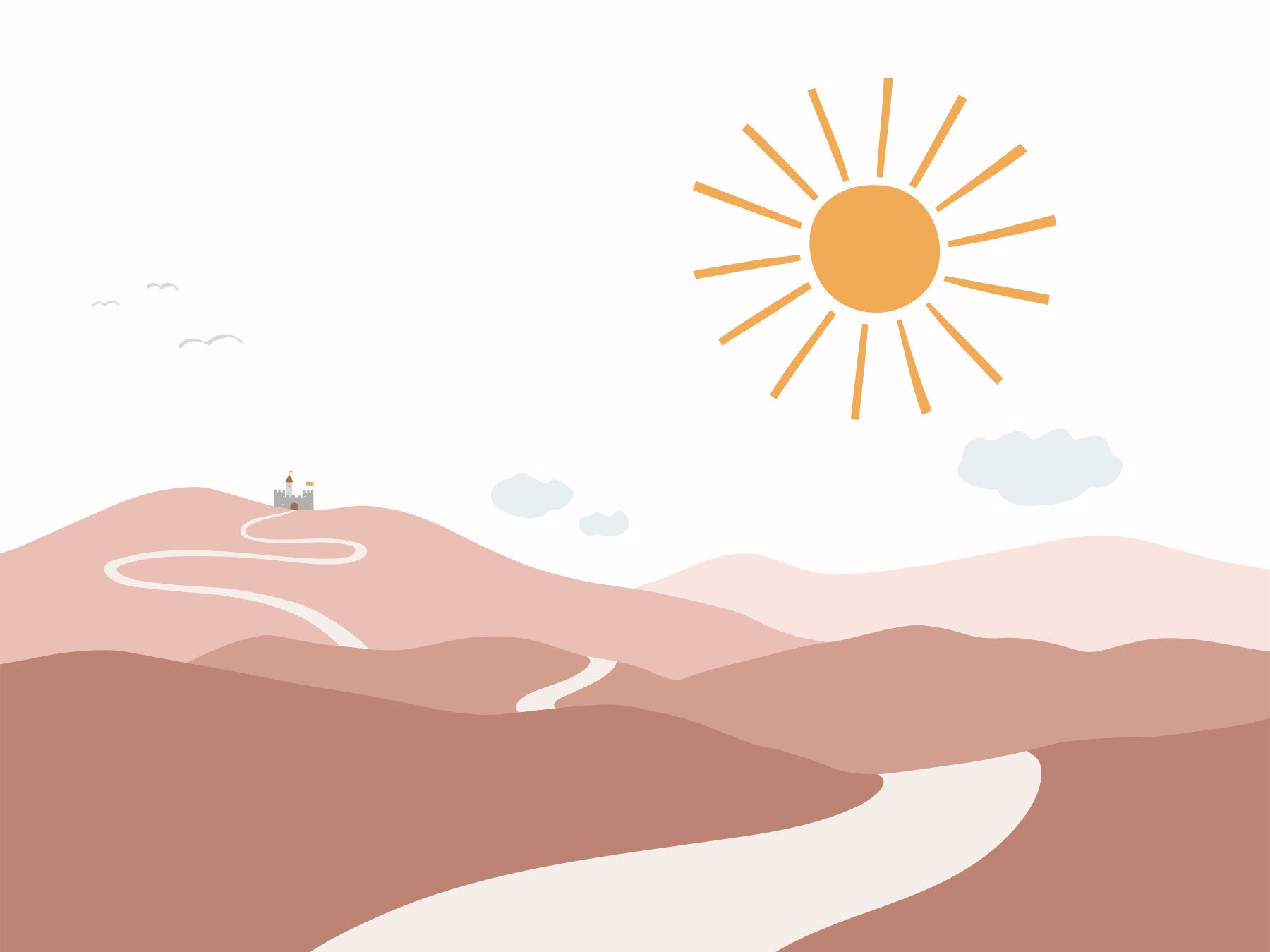 This wallpaper showcases a charming illustration of a winding path leading up to a fairytale castle nestled atop a distant hill. The muted tones and simple lines create a sense of tranquility and wonder. The addition of a bright, stylized sun adds a touch of warmth and joy. This design is perfect for creating a dreamy and peaceful atmosphere in a child's room or any space needing a touch of magical realism. The image subtly invites viewers on a journey of imagination and adventure, offering a sense of hope and possibility.