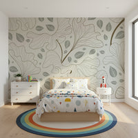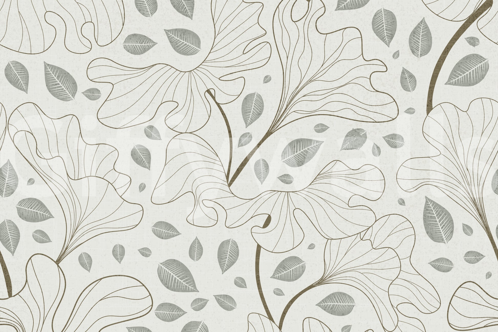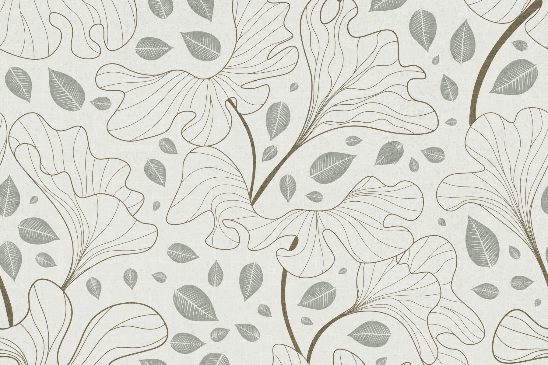 This stylish wallpaper features a seamless pattern of lined botanical shapes and scattered leaves. The muted colors, a blend of soft beige and gentle grey, lend a calm, sophisticated mood to your space. The repeating design creates an open and airy feel, suitable for any room. Use this wallpaper for walls to create a feature wall in a living room, bedroom, or hallway. It offers a modern, elegant look that enhances your interiors.