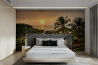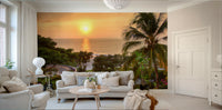 Transform your room into a tropical haven with this breathtaking wallpaper. It showcases a stunning sunset scene with palm trees silhouetted against a vibrant sky. The design exudes tranquility and warmth. This wallpaper for walls is especially good for living spaces and bedrooms. The rich colors and serene atmosphere will help to create a relaxing and inviting interior. Transport yourself to a peaceful island with this captivating view.