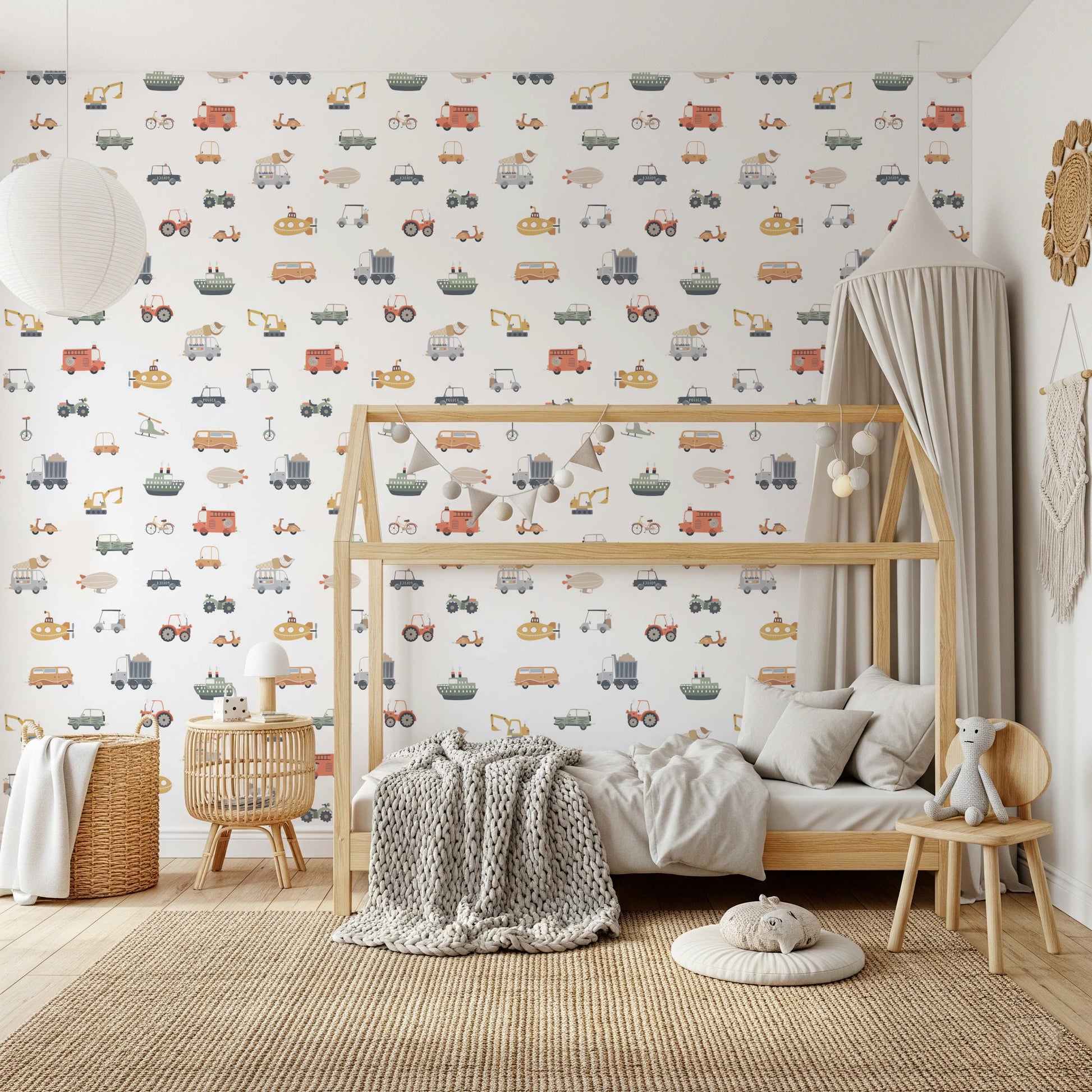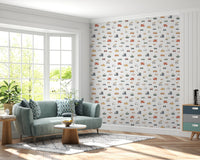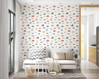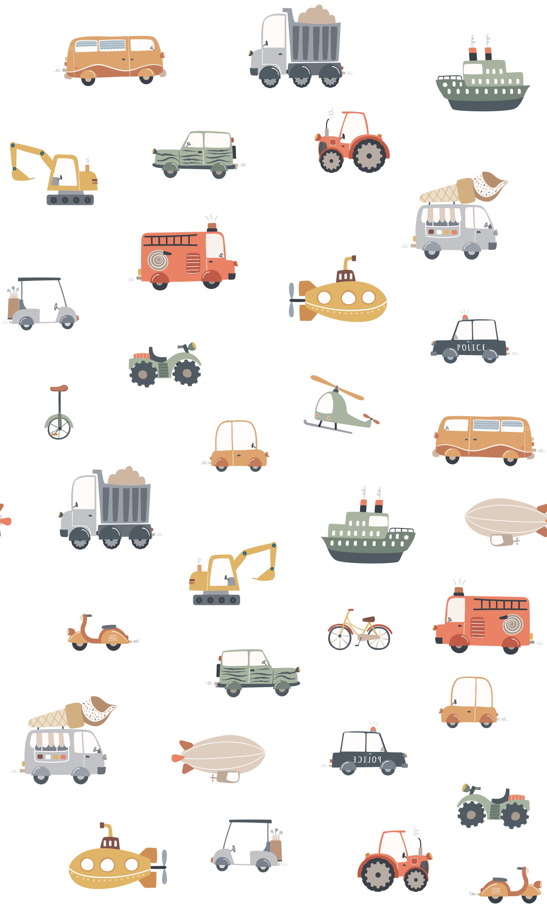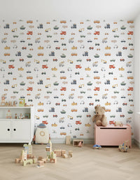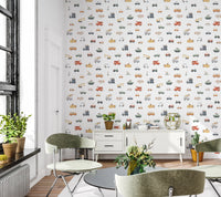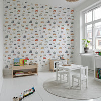 Transform your child’s space with this whimsical collection of vehicles. The wallpaper for walls features a fun pattern with trucks, cars, fire engines, and boats. Each design is rendered in a simple, cartoon style. A palette of soft beige, gentle green, pastel yellow, and classic orange gives the wallpaper a warm and inviting quality. Great for kids' rooms, play areas, or even a quirky bathroom, this design injects playfulness into the décor. This wallpaper becomes a focal point, infusing personality into otherwise plain spaces.
