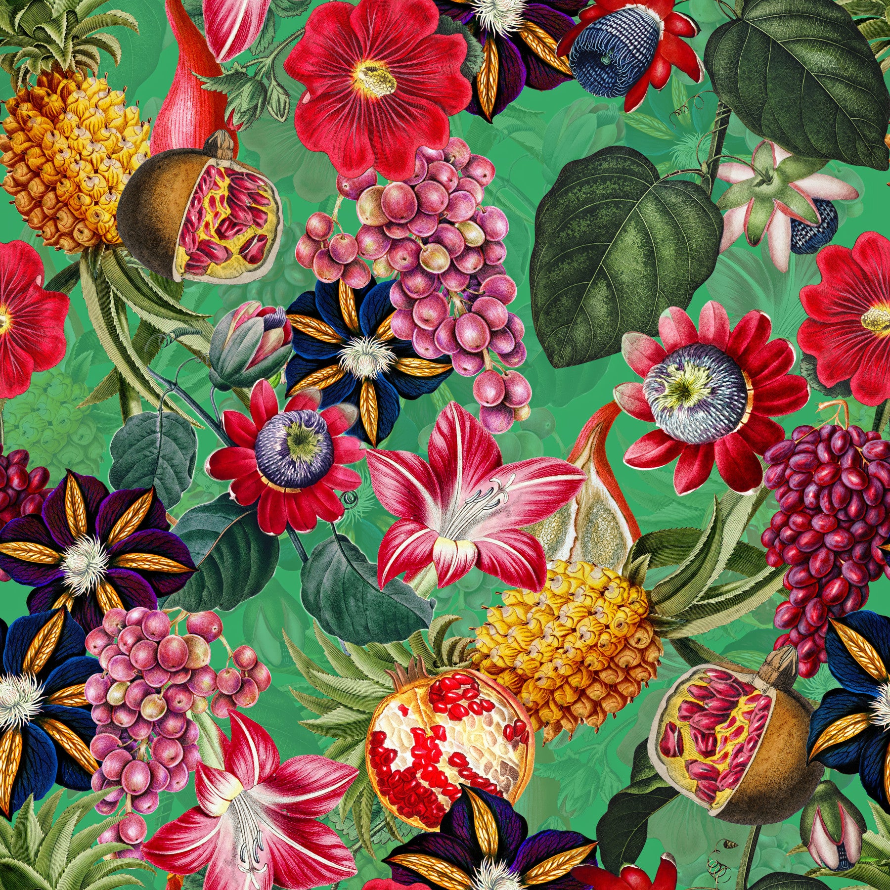 Escape to a vibrant 'Tropical Eden' with this stunning wallpaper. The design features a profusion of exotic fruits and flowers, each depicted with exquisite detail in a style reminiscent of vintage botanical illustrations. Pineapples, pomegranates, and clusters of grapes mingle seamlessly with vibrant passion flowers, amaryllis, and other tropical blooms. The rich jewel tones and lush greens create a sense of immersive tranquility, transporting you to a sun-drenched paradise. A perfect choice for those seeking a bold and sophisticated statement piece for their home.