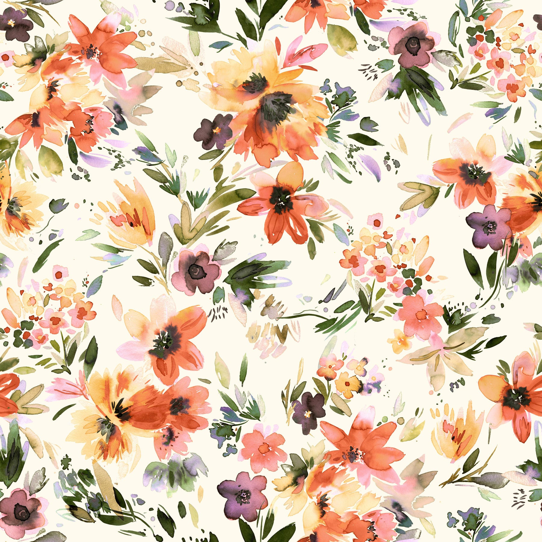 Embrace the vibrant energy of the tropics with this exquisite watercolor wallpaper. A profusion of loosely painted blossoms in warm coral, peach, and sunny yellow hues bursts across a soft cream background. The flowers, rendered with a painterly, almost impressionistic style, evoke a sense of relaxed, carefree summer days. Delicate greens and hints of purple add depth and contrast, while the loose brushstrokes create a dynamic and effortlessly chic aesthetic perfect for adding a touch of tropical paradise to any digital device.