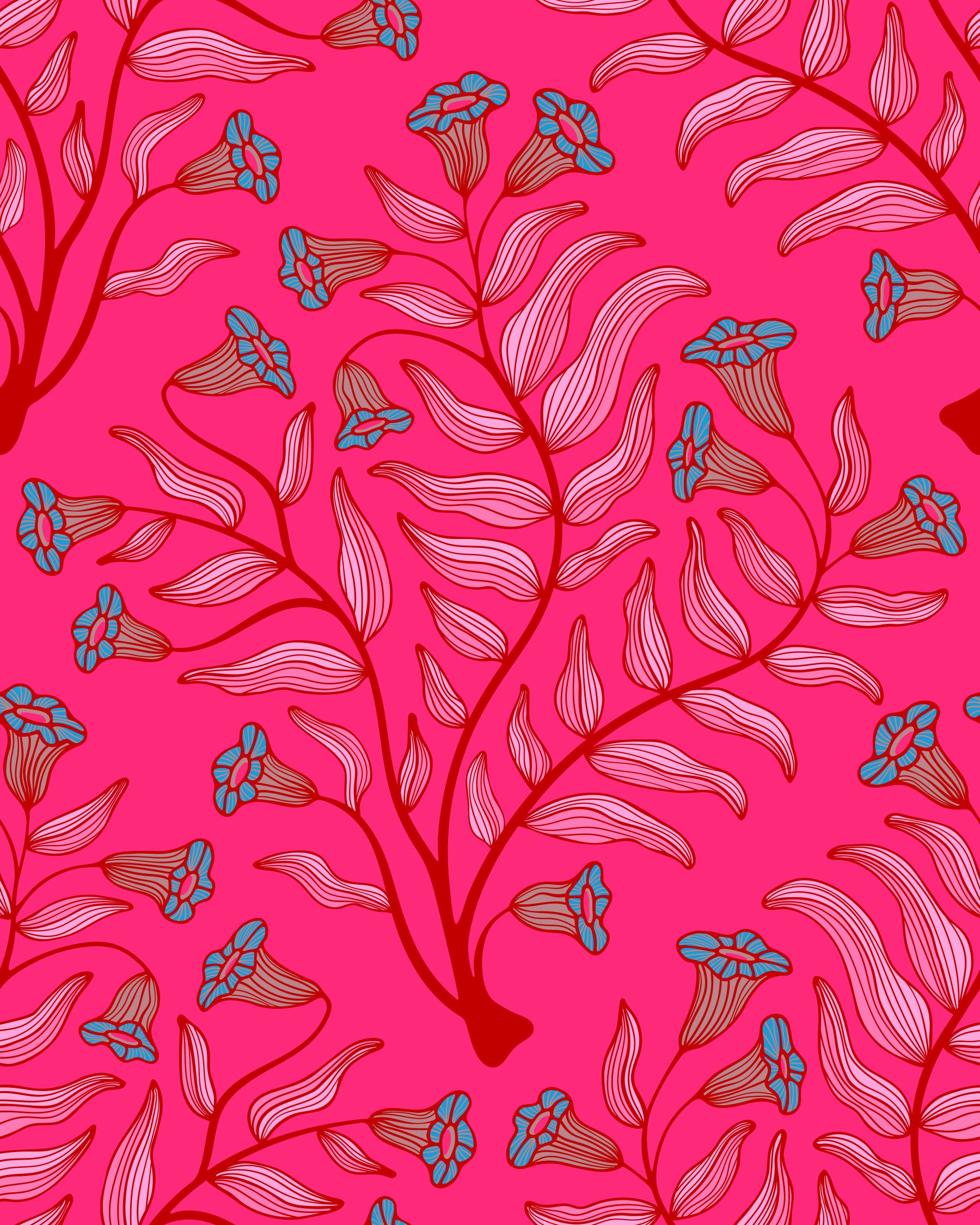 This vibrant wallpaper showcases a stunning botanical damask pattern featuring stylized trumpet flowers in jewel-toned pink and cherry red. Delicate, line-drawn leaves and flowers in varying shades of pink intertwine with bold red stems on a glamorous fuchsia hot pink background. The turquoise petals of the trumpet flowers provide a colourful contrast, adding a touch of unexpected coolness to this otherwise fiery floral display. Perfect for your feminine spaces! This pattern design is also available in Other Colourways too! Original wallpaper pattern design by Jackie Tahara of UnBlink Studio.