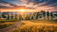Transform your space with this captivating wallpaper for walls, showcasing the idyllic beauty of Tuscany at sunset. Golden fields of wheat and lush vineyards stretch across rolling hills, bathed in the radiant glow of the setting sun. A charming stone villa, flanked by stately cypress trees, adds a timeless touch to the picturesque landscape. The vibrant palette of warm oranges, deep blues, and rich greens creates a serene and inviting atmosphere. This design enhances living rooms, dining rooms, and bedrooms, bringing the peaceful elegance of the Italian countryside indoors. It infuses any space with tranquility and sophisticated natural charm.