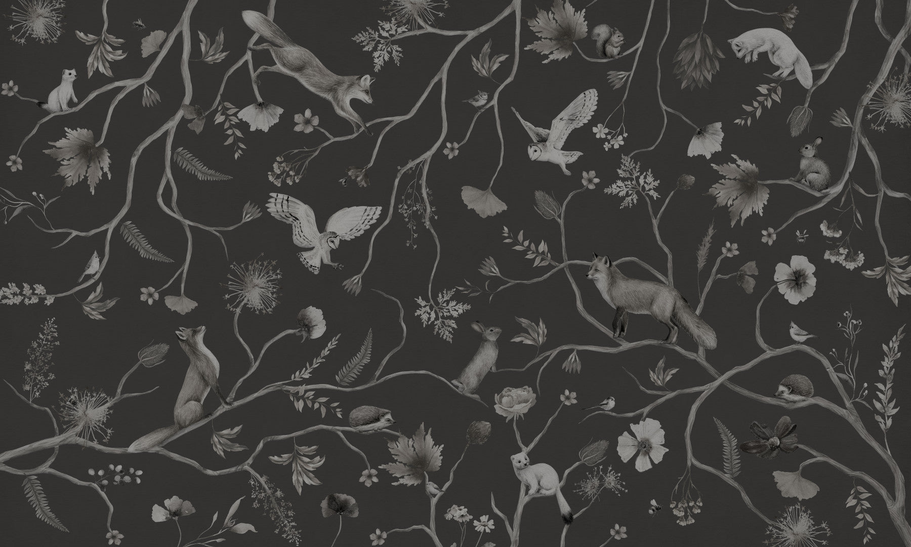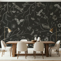 Transform your space with this unique wallpaper. The intricate grayscale design depicts woodland animals gracefully positioned on branches and among delicate flowers and leaves, creating a serene and sophisticated atmosphere. This distinctive wallpaper for walls blends seamlessly with various décor styles. It is perfect for a relaxing bedroom, or an elegant living room, introducing an artistic expression of nature into your home. This design brings a calming essence to interiors seeking understated charm.