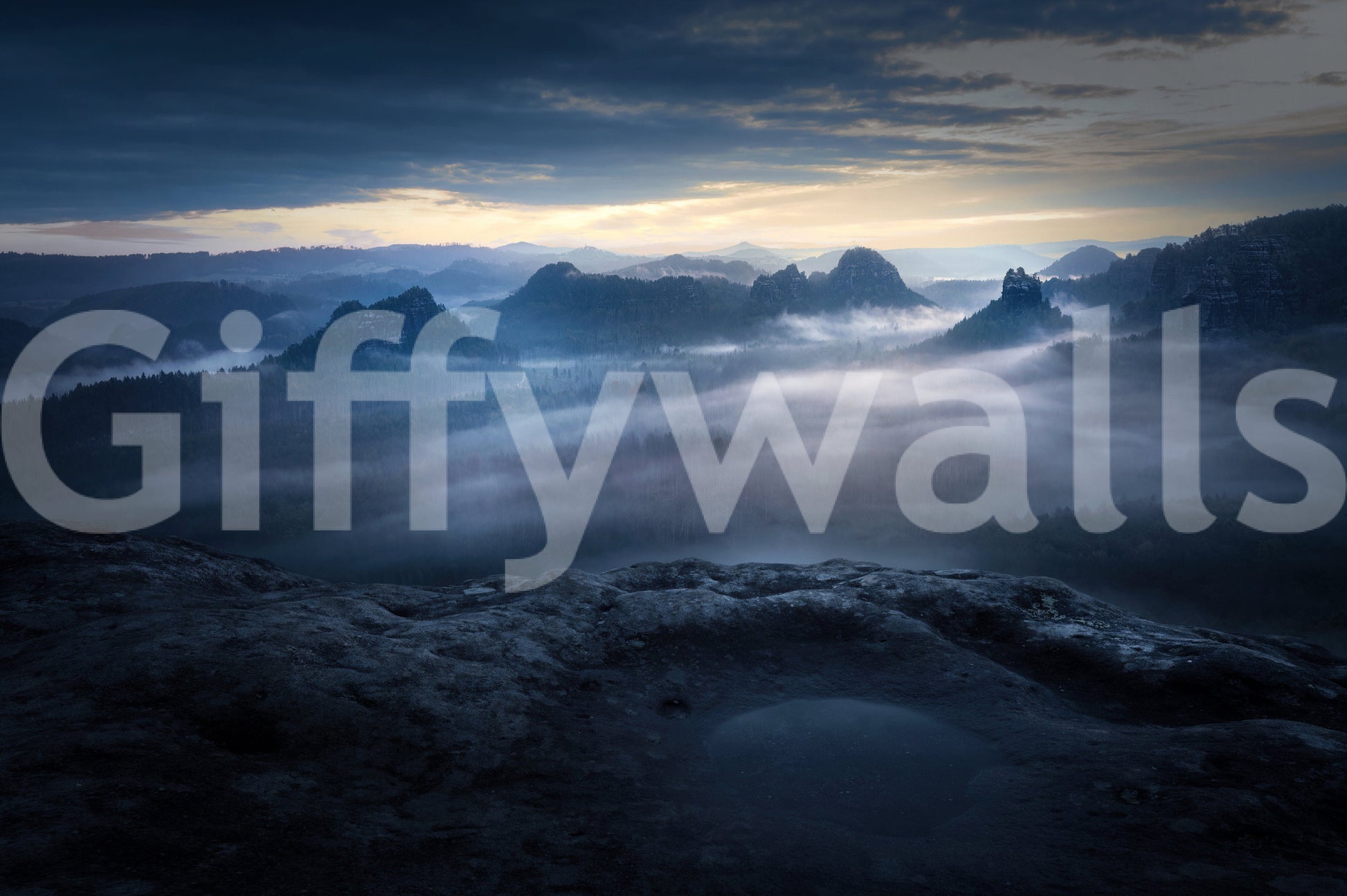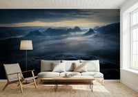 Transform your interiors with this evocative image. Hazy mountains rise in the distance, softened by a dreamlike mist. The palette features deep blues, soft yellows, and shades of gray, lending a calm feel. Install this wallpaper for walls in your bedroom, study, or even the hallway to build an atmosphere. This scene supports minimalism, modern and serene decor. It adds a touch of nature to indoor spaces.