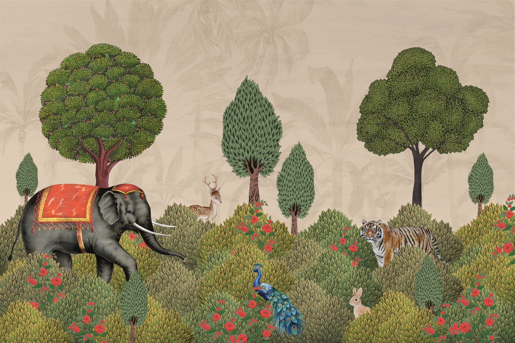 Discover the Van Vaibhav mural, a magnificent celebration of the Splendor of the Forest. This exquisite wallpaper captures the essence of traditional Indian artistry, transforming your space into an enchanted woodland. A royally adorned elephant journeys through a lush landscape, sharing a serene moment with a majestic tiger, a graceful peacock, and a gentle deer. Set against a backdrop of rich foliage and blooming flowers, this design evokes a sense of harmony and timeless elegance. The Van Vaibhav mural is more than just a wall covering; it is a piece of narrative art that brings nature's grand and tranquil story into your home.