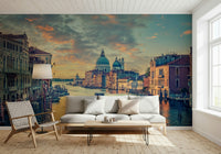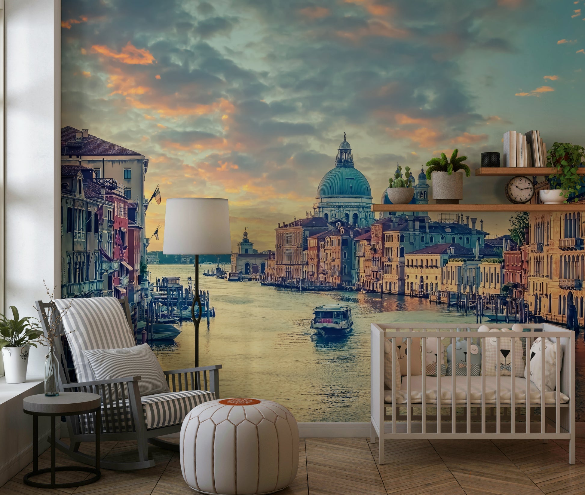 Capture the beauty of Venice with this stunning wallpaper for walls. The design showcases the Grand Canal at dawn, bathed in the warm glow of the sunrise. Notice the detailed architecture of the buildings and the shimmering reflections in the water. The color palette of blues, golds, and creams brings a tranquil atmosphere to any room. It works beautifully in living rooms, dining areas, or bedrooms. Bring a touch of European elegance to your space with this design.