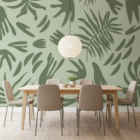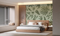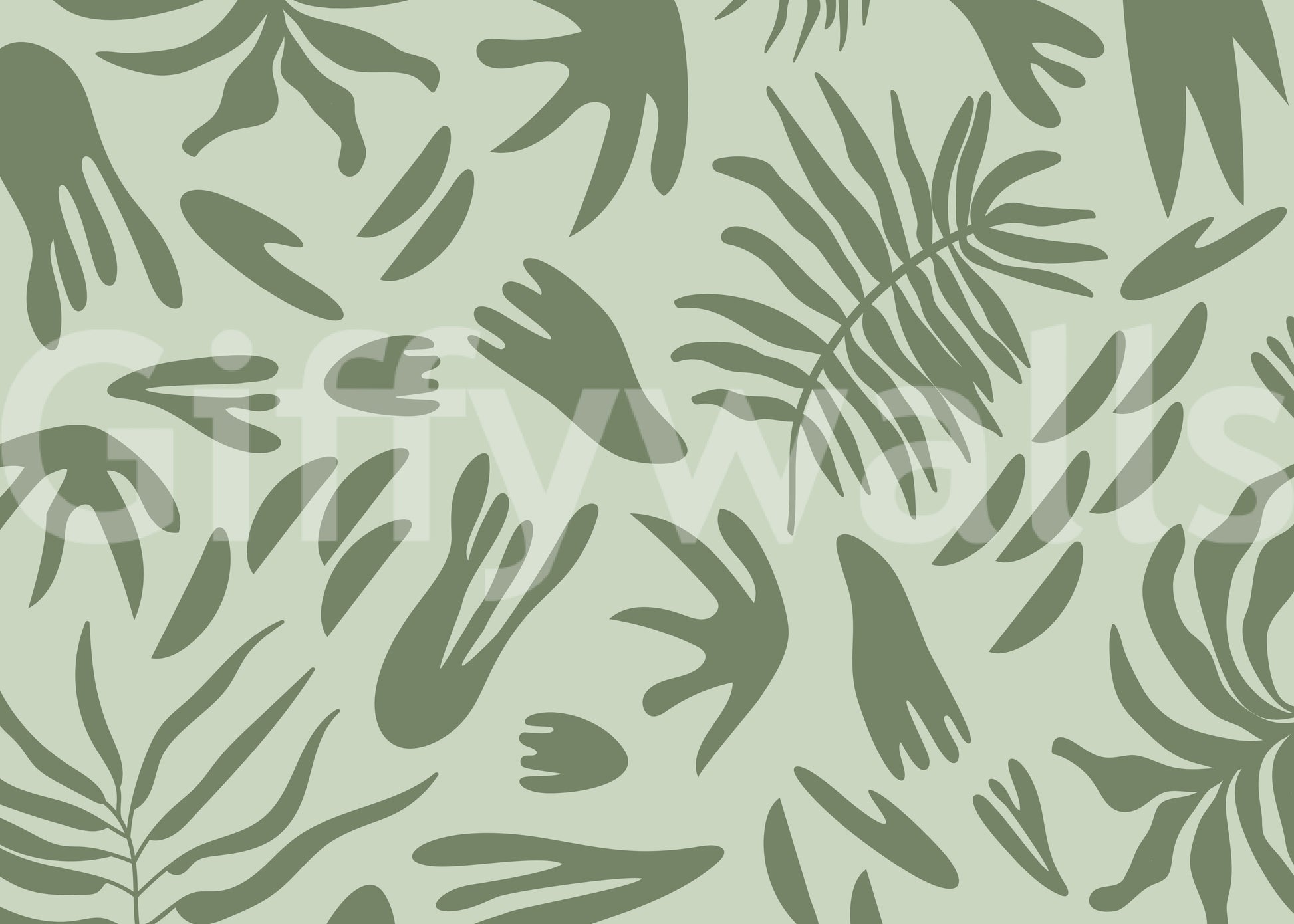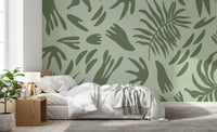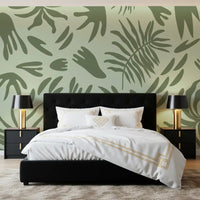 Transform your living space with this captivating abstract botanical wallpaper for walls. Its modern design features an array of stylized leaf and organic shapes, creating a fluid and continuous pattern across your surfaces. The serene color palette showcases soft sage green as the backdrop, beautifully contrasted by deeper olive green forms. This sophisticated blend offers a calming and refreshing atmosphere, perfect for fostering tranquility. Install this elegant pattern in bedrooms, living rooms, or home offices to cultivate a peaceful retreat. It complements minimalist and contemporary interiors, adding a touch of natural artistry without overwhelming the room. The clean lines and biophilic elements enhance any space with subtle visual interest and a sophisticated, organic feel.