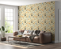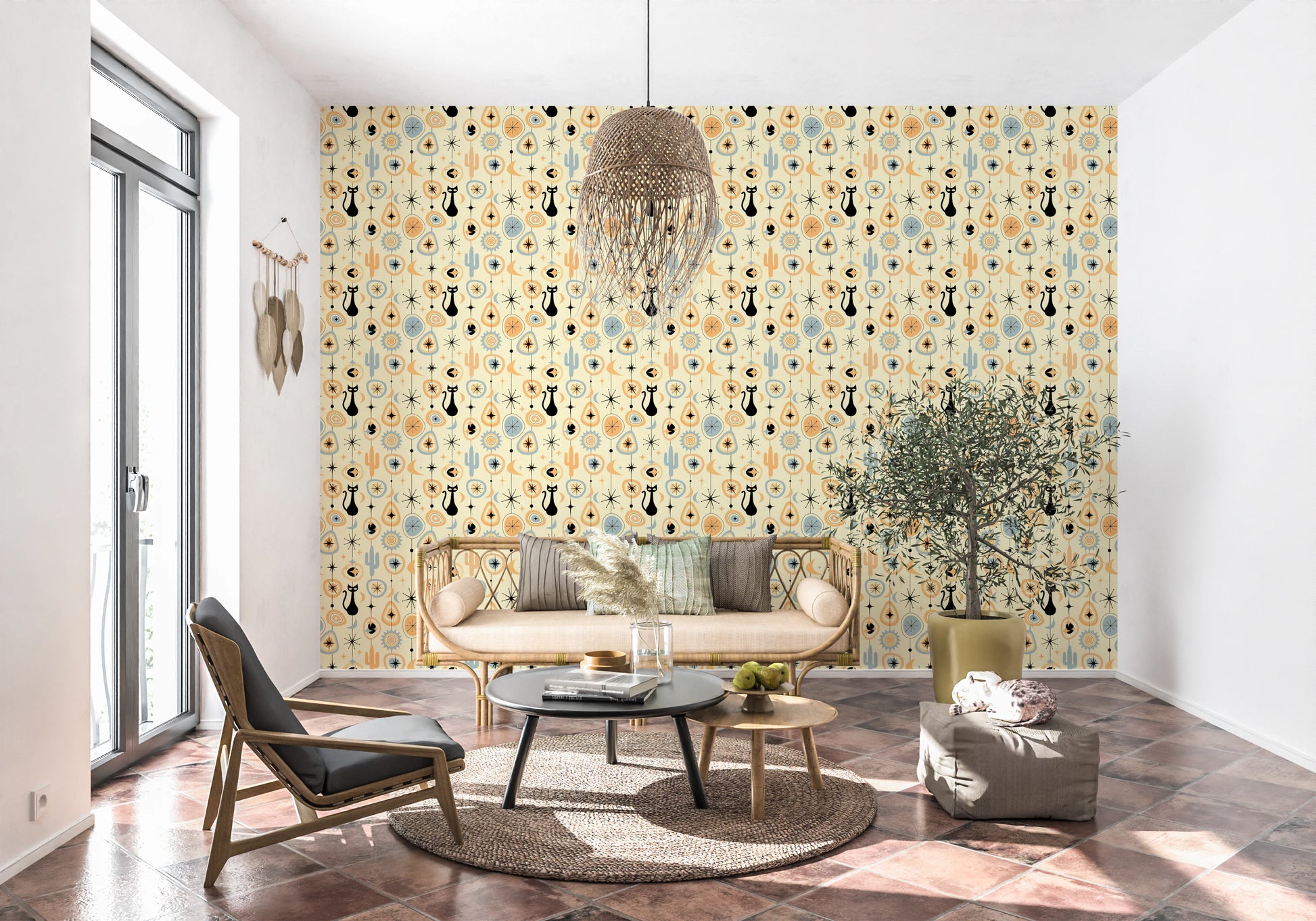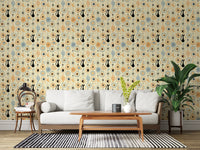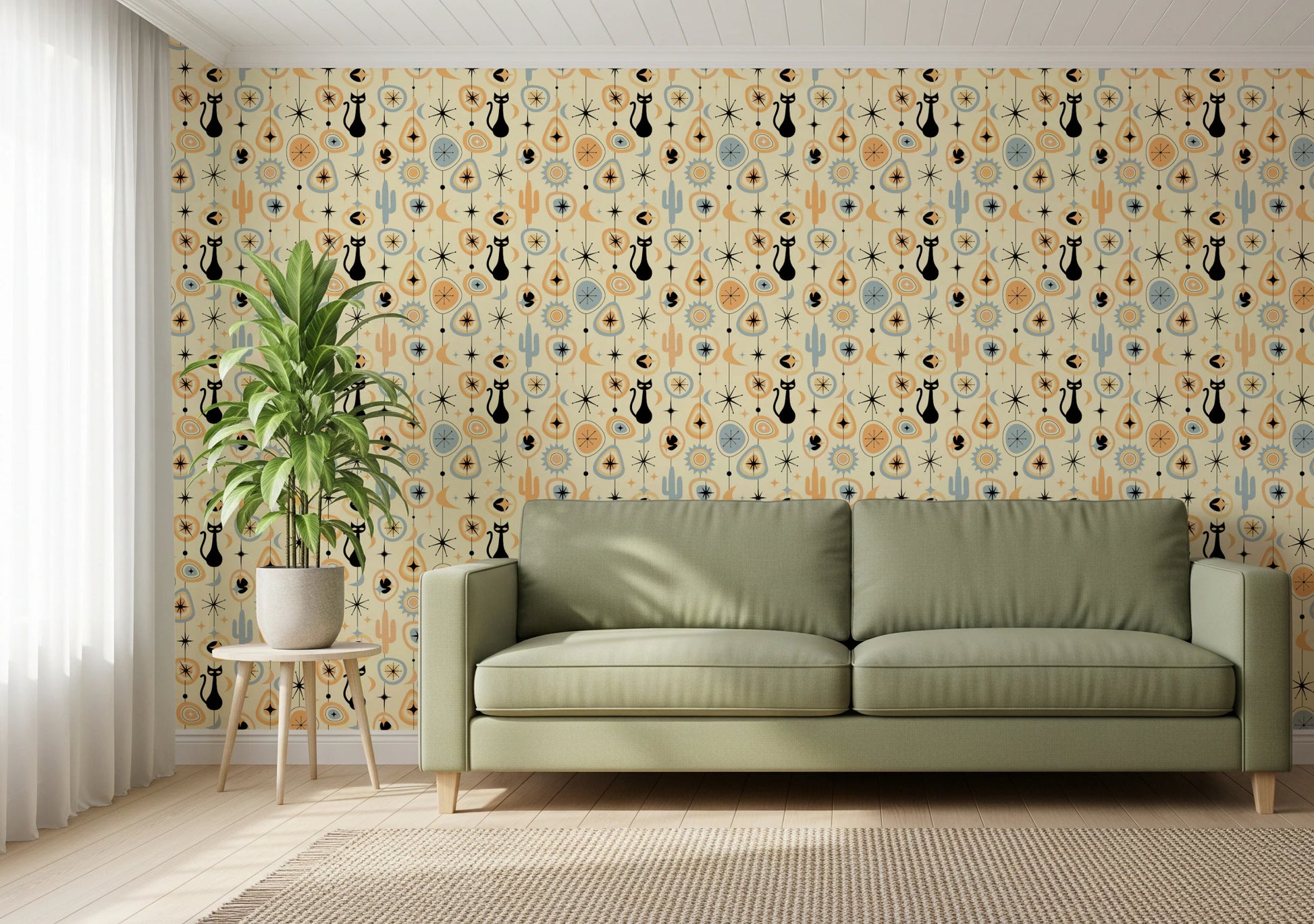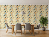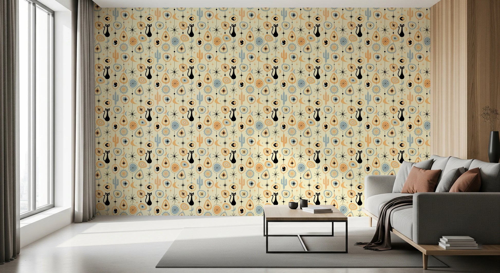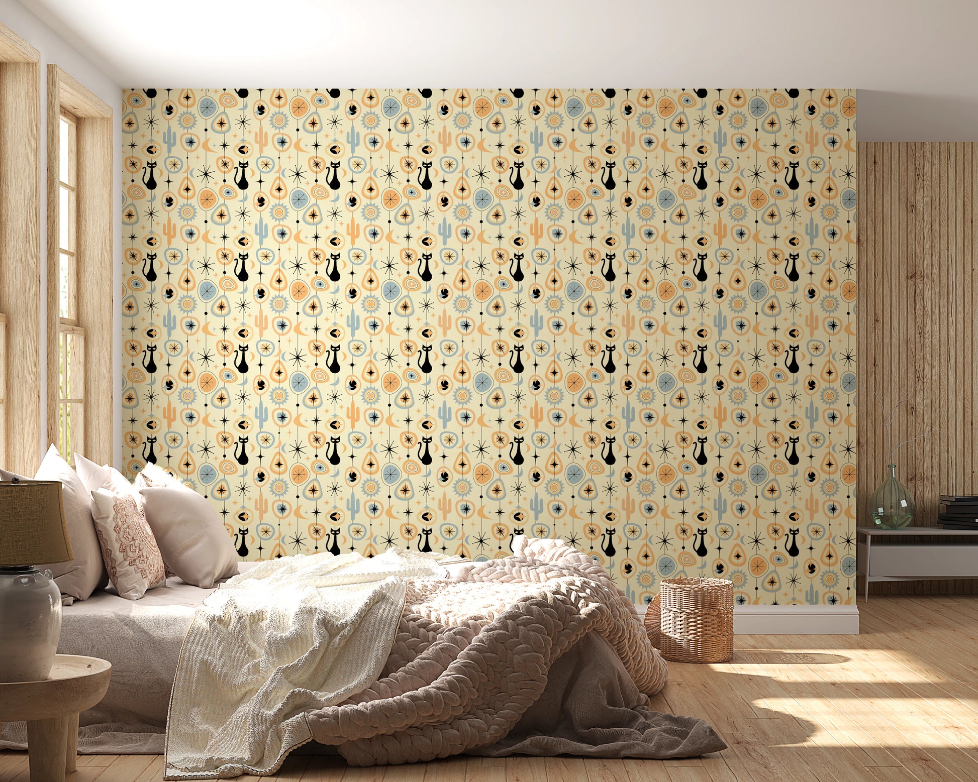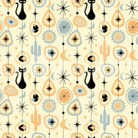 Transform your space with the retro-futuristic charm of 'Vintage Atomic Desert Night'. This wall décor encapsulates the cool sophistication of mid-century modern design, transporting you to a starlit desert landscape. Silhouetted black cats prowl beneath stylized moons and atomic starbursts, rendered in a palette of warm peach, cool blue, and creamy ivory. Iconic cacti and geometric shapes, reminiscent of vintage linoleum patterns, add depth and intrigue. Evoking a sense of nostalgia and timeless elegance, this piece lends a touch of playful sophistication to any room. This design is perfect for those who appreciate retro aesthetics with a modern twist, bringing a unique and captivating focal point to your home.