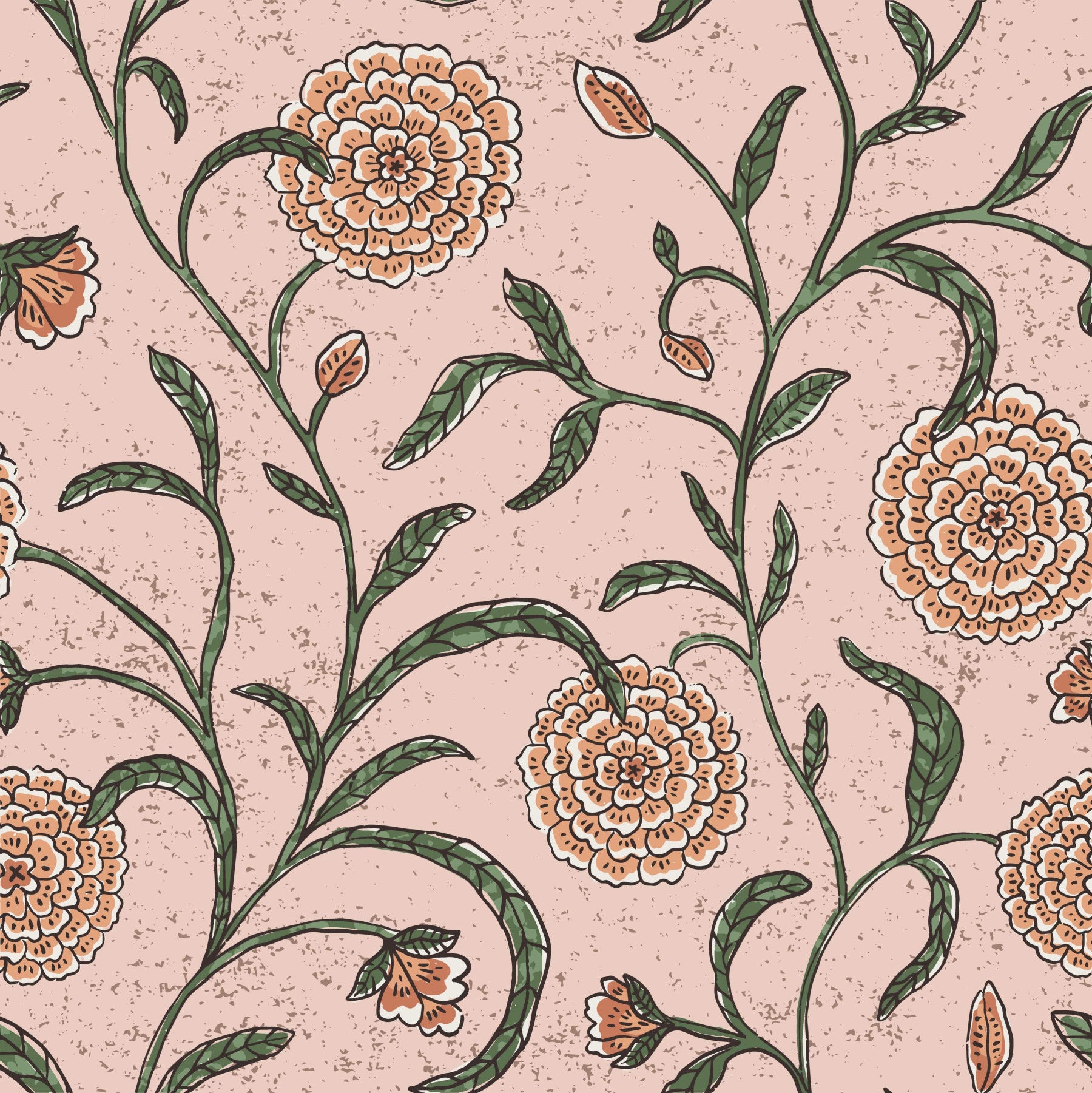 Invite a touch of retro charm with this captivating wallpaper. Dainty apricot blossoms on winding green stems create a seamless botanical rhythm against a blush pink backdrop. The design offers warmth to living rooms and brings a calm feeling to bedrooms. Use this wallpaper for walls to complement both classic and modern decors, enhancing your interior with a timeless, hand-drawn appeal. It pairs perfectly with wooden furniture and neutral textiles.