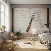 Adorn your walls with the charm of yesteryear using this vintage cookbook design. The muted tones of aged paper and classic typography create a refined ambiance. This wallpaper for walls features antique recipes and a rustic fork, lending a touch of culinary history to your space. It works exceptionally well in kitchens, dining rooms, or even a home office, adding a sophisticated, scholarly feel. The design complements both traditional and modern interiors, bringing an element of understated elegance and timeless appeal.