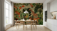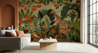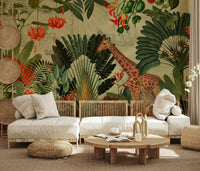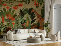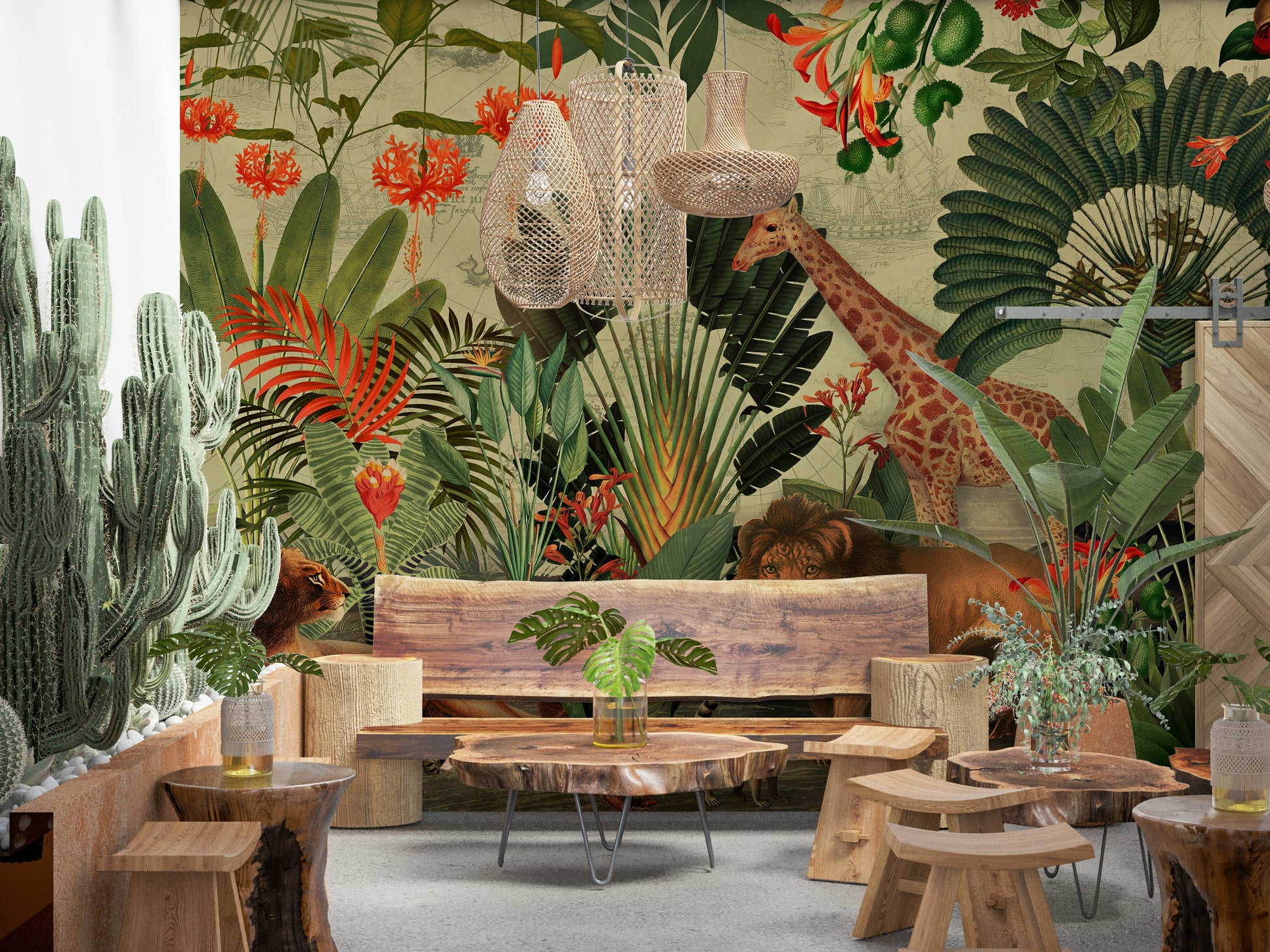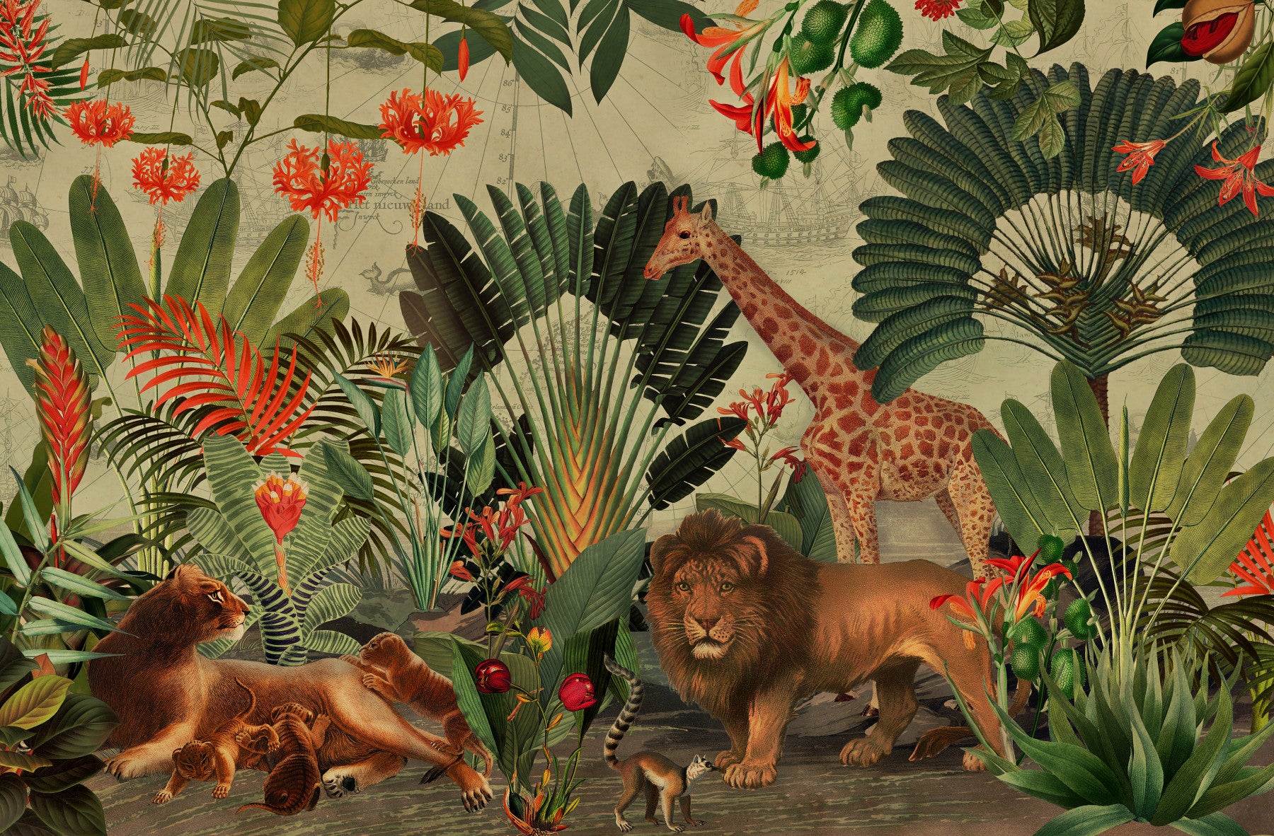 Journey to a hidden world with this breathtaking wallpaper. The design masterfully blends vintage botanical illustrations of vibrant tropical flora and fauna with a faded antique world map, creating a sense of adventure and discovery. A majestic giraffe and a lion family share the scene amongst lush foliage, transporting viewers to an exotic paradise. The detailed artwork invites exploration, while the muted background and warm color palette create a serene and sophisticated atmosphere. Perfect for adding a touch of elegance and intrigue to any room, this wallpaper is a captivating blend of nature's beauty and historical exploration.