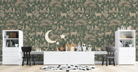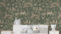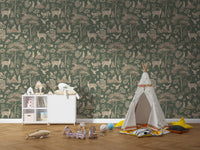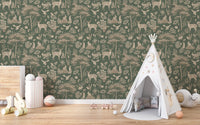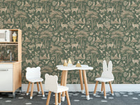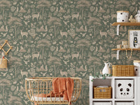 Immerse your space in the beauty of nature with vintage green wildlife wallpaper. Featuring hand-drawn deer, woodland animals, and flourishing trees, this classic design brings the tranquility of the forest into your home. The rich green backdrop enhances the intricate detailing, making it an excellent choice for cozy living spaces, studies, or heritage-inspired interiors. The muted sepia tones of the wildlife elements create a nostalgic and rustic feel, pairing seamlessly with wooden accents and earth-toned decor. Whether you're aiming for a traditional, cabin-style atmosphere or a refined vintage look, this wallpaper adds depth and character to any setting.
