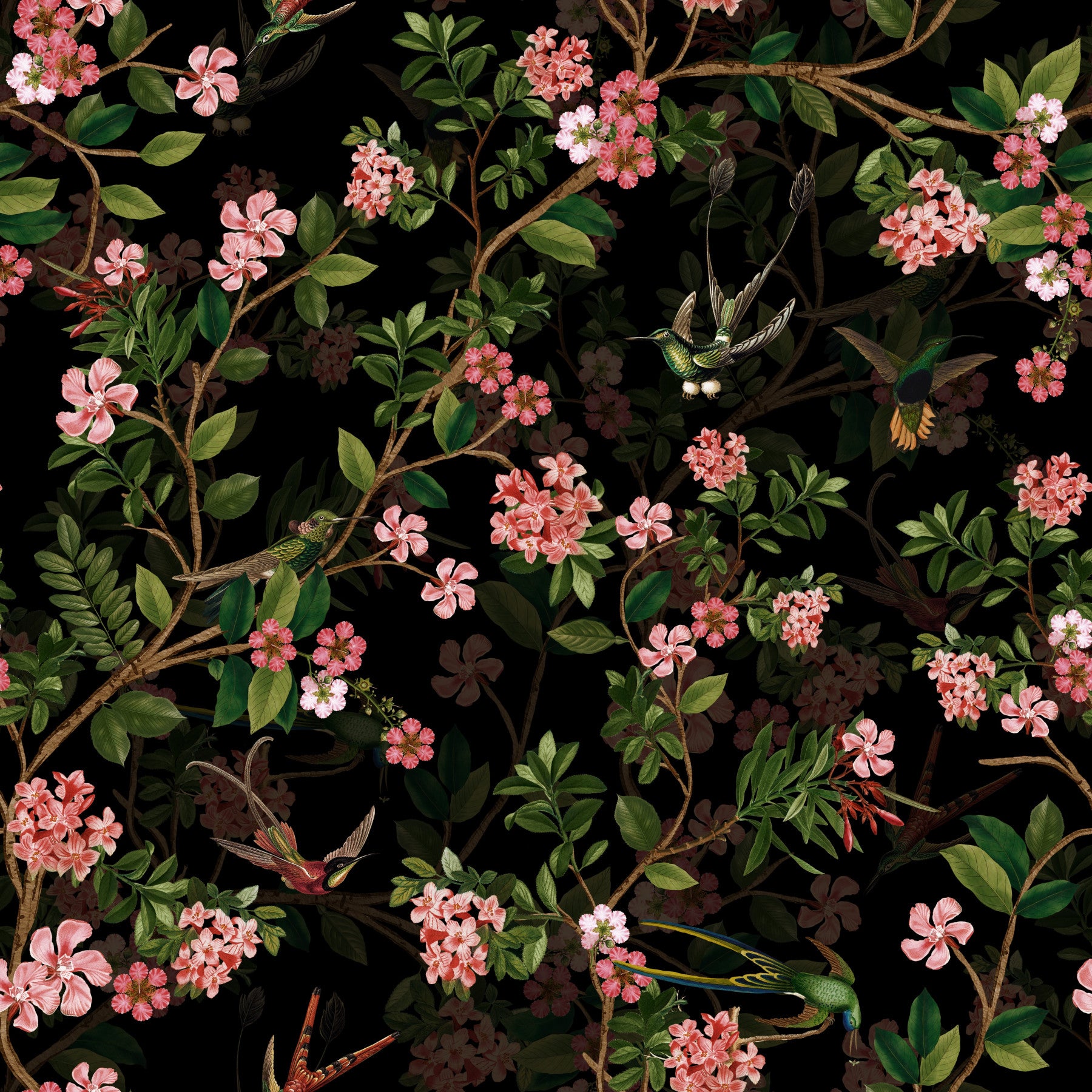 Infuse your home with the enchantment of a tropical paradise. This wallpaper by Uta Naumann for walls features delicate pink flowers entwined with vibrant green foliage, against a striking black backdrop. Graceful hummingbirds flutter among the branches, creating a mesmerizing scene. This design elevates interiors, making it perfect for living rooms, bedrooms, or dining areas. Let the botanical artistry transform your space into a captivating haven of natural beauty, lending a touch of sophisticated charm.