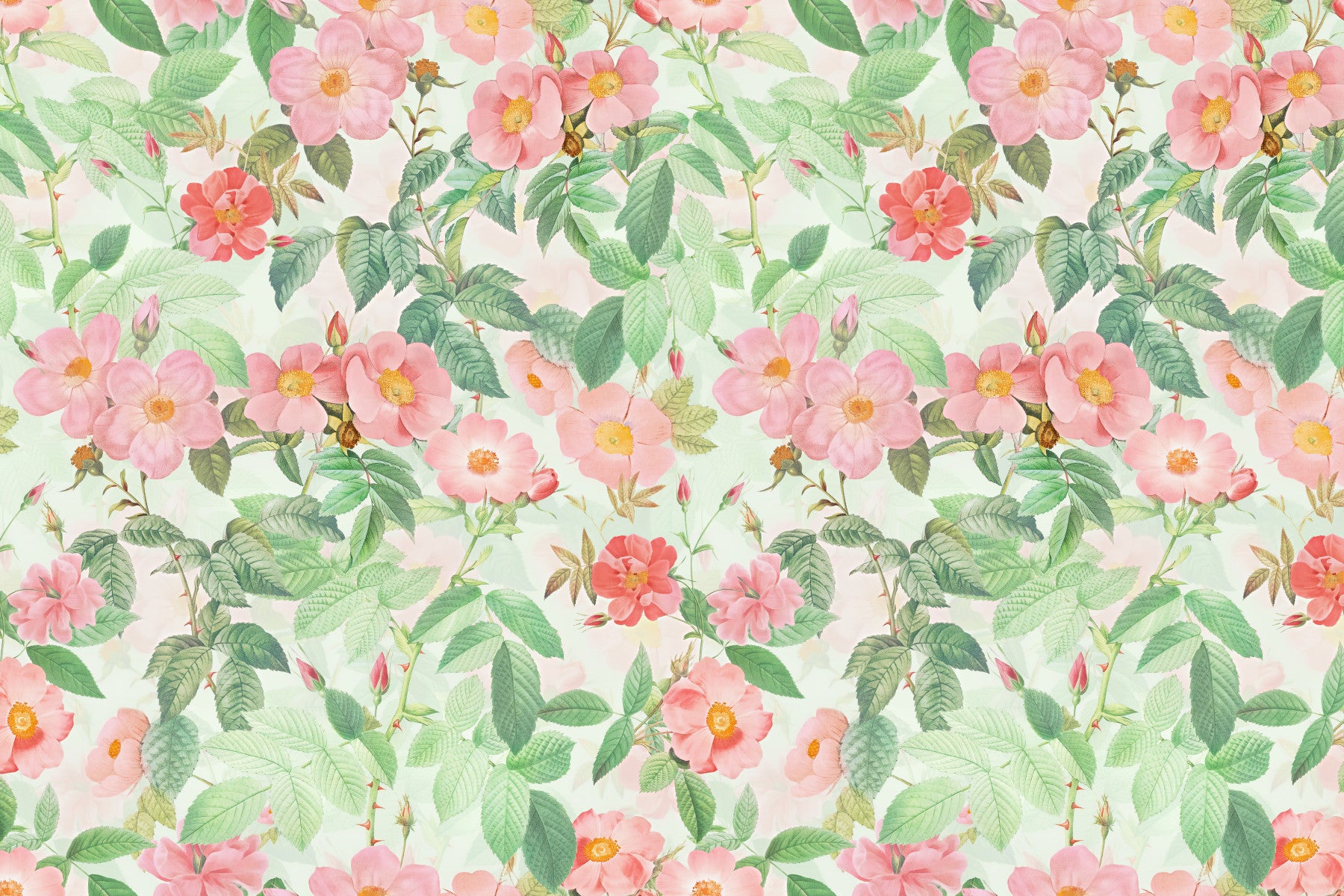 Bring the charm of a vintage rose garden indoors with this delicate floral design by Uta Naumann. Pink and coral roses intertwine with lush green foliage on a subtle background. Perfect for bedrooms, living rooms, or dining rooms, this wallpaper for walls creates a calm and relaxing space. The gentle colors complement a range of interiors, from classic to modern farmhouse, adding a touch of timeless beauty to any room. Transform your home with this elegant botanical pattern.