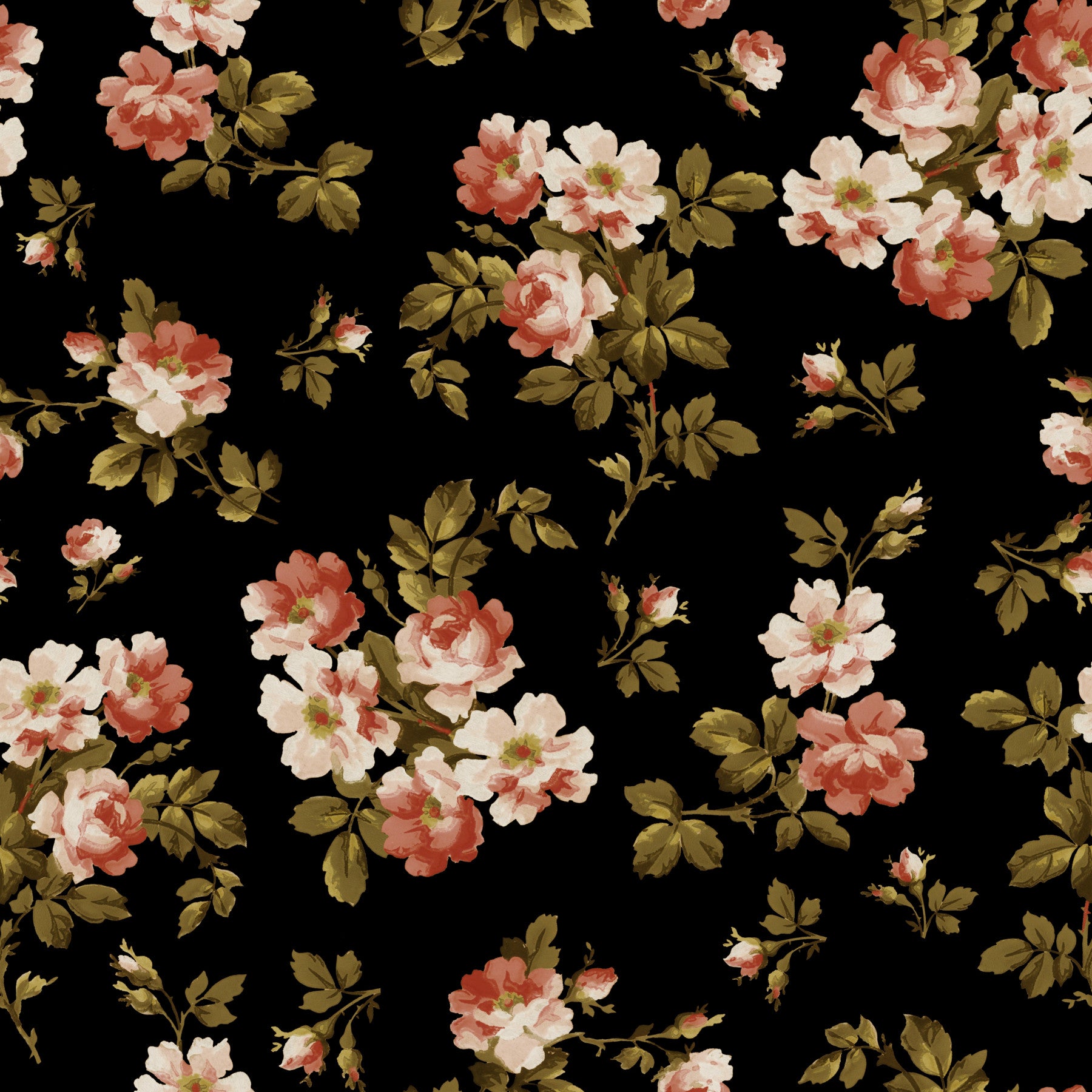 Step into a timeless world of floral charm with 'Vintage Rose Garden.' This wallpaper showcases a captivating pattern of meticulously painted roses in soft blush pinks and warm terracotta hues, artfully arranged against a rich black backdrop. The design evokes a sense of classic elegance, reminiscent of antique botanical illustrations. Each rose is rendered with exquisite detail, showcasing the delicate texture of its petals and the subtle variations in its coloring, creating a truly enchanting visual experience. The deep black background allows the roses to truly stand out, while creating a sophisticated and calming atmosphere suitable for any room in your home, adding a unique touch of understated luxury.