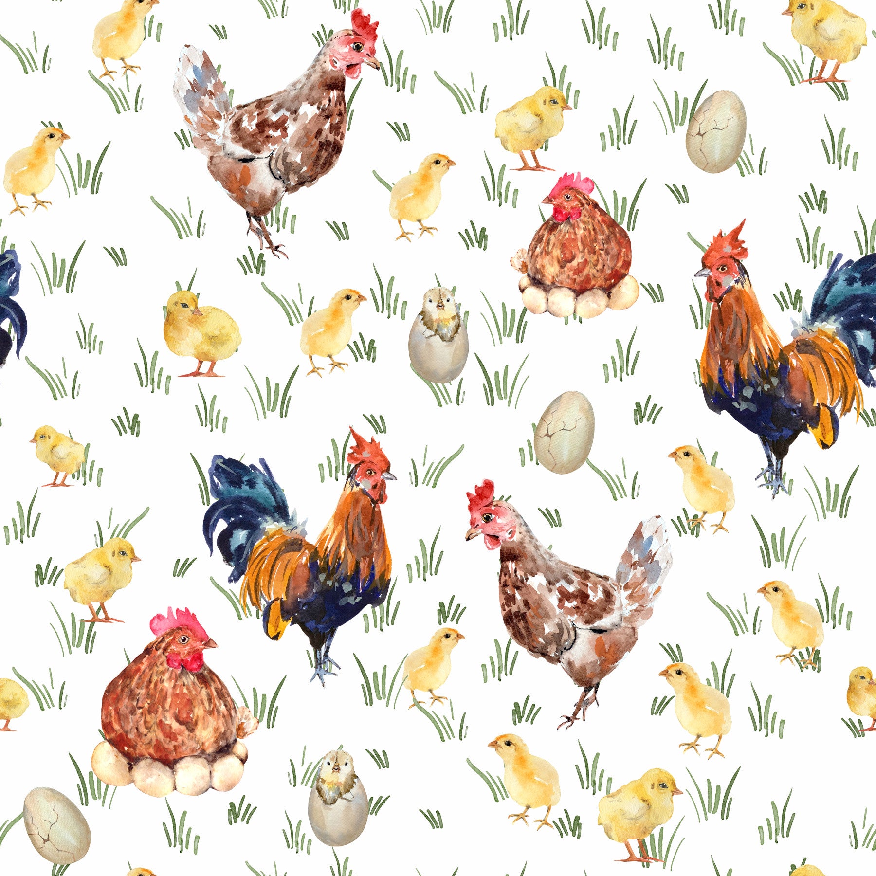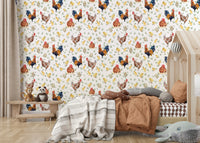 Add a dash of rustic charm with this delightful chicken and chick themed watercolor wallpaper for walls by Uta Naumann. This design showcases playful illustrations of hens, roosters, and fluffy chicks amidst blades of green grass and hatching eggs. The watercolor technique lends a soft, painterly quality, perfect for enlivening a nursery, playroom, or country kitchen. Its inviting design complements interiors inspired by farmhouse living, adding an atmosphere of warmth and joyful simplicity.