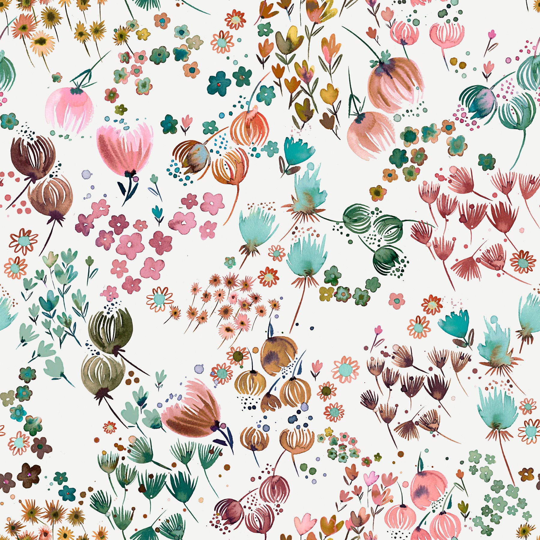 A vibrant and whimsical watercolor wallpaper featuring a profusion of green and orange flower buds. Loosely painted blossoms in shades of pink, orange, and teal dance across a soft white background, creating a cheerful and airy atmosphere. The delicate watercolor textures and varied floral forms evoke a sense of springtime freshness and effortless beauty. Perfect for adding a touch of organic elegance to any digital device, this wallpaper offers a calming yet stimulating visual experience with its playful composition of blooming buds and scattered smaller blooms.
